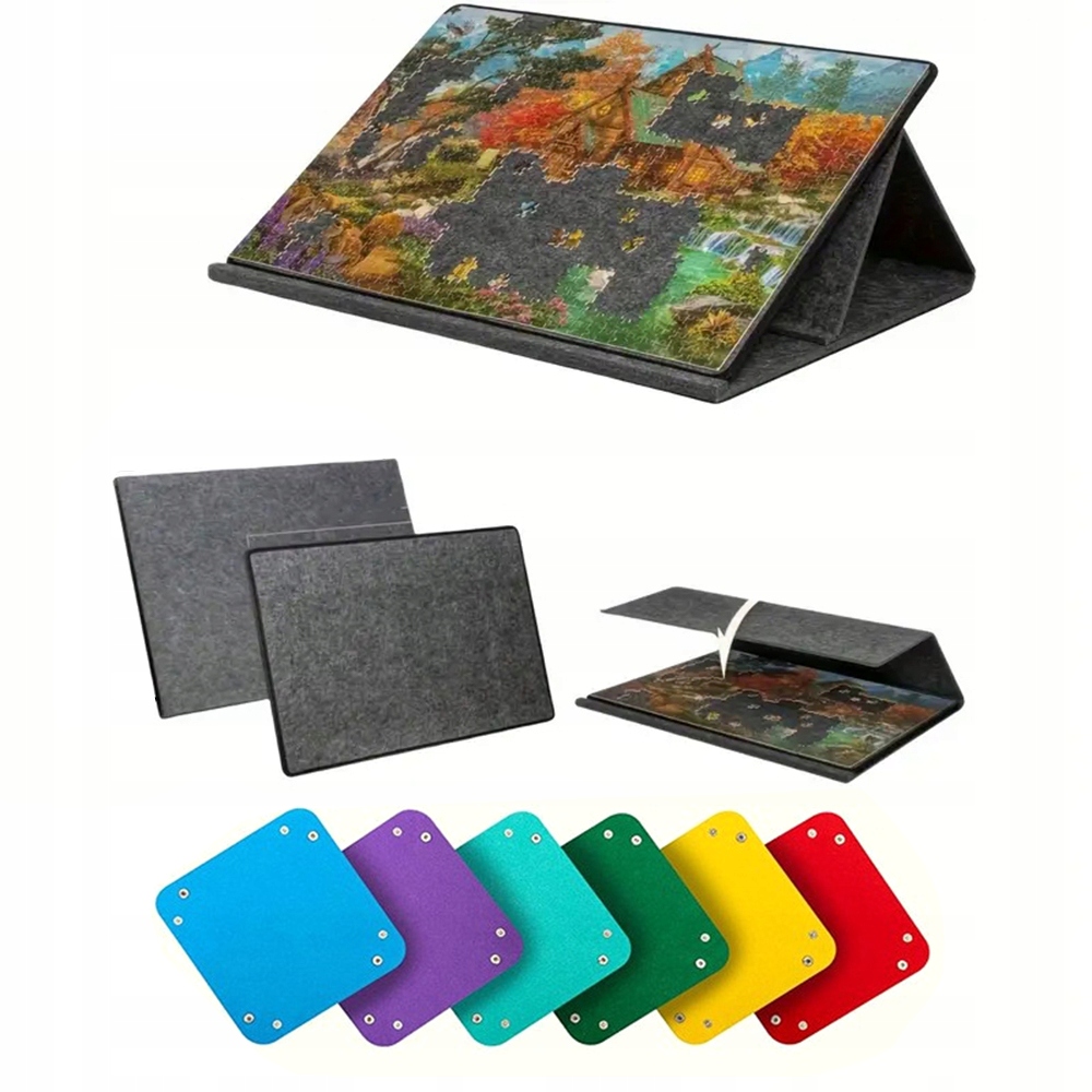 Задняя опорная пластина имеет регулируемый угол наклона с помощью липучки, что позволяет надежно поддерживать доску под нужным углом. В сложенном виде пылезащитный чехол защищает незавершенные пазлы от пыли и не дает домашним животным трогать и разрушать их.