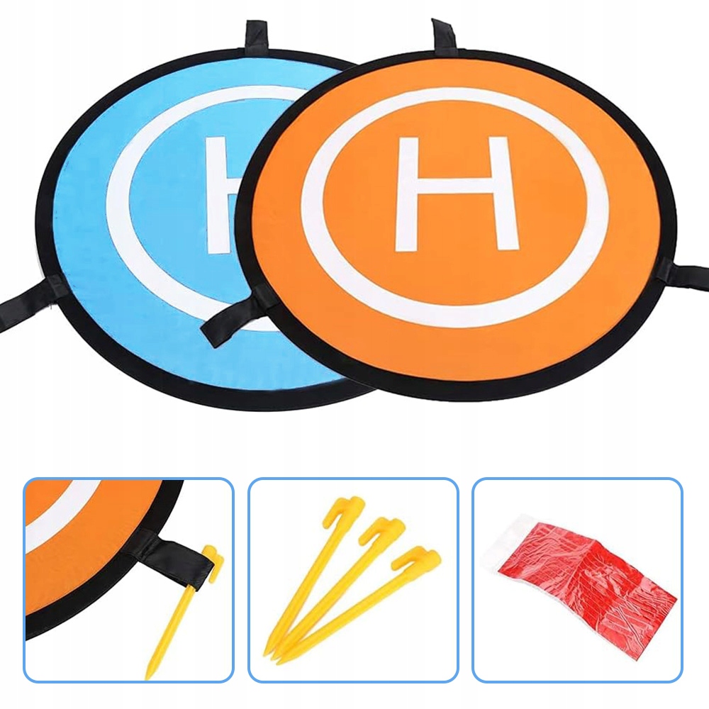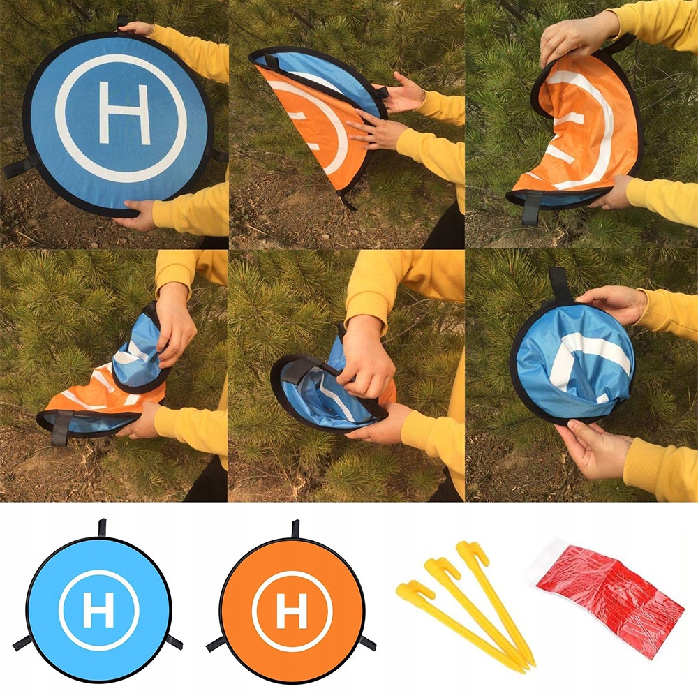 ✅В комплект входят — подставка для дрона (оранжевая и синяя стороны), 3 булавки для крепления площадки к земле, 8 полосок светоотражающей ленты, прочная нейлоновая дорожная сумка.