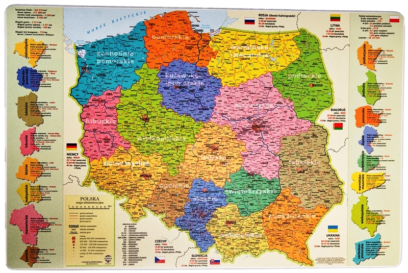 <р>2. Дополнительно по бокам имеется описание отдельных воеводств, а именно: столица воеводства, количество повятов и их основных городов, количество гмин, площадь, количество жителей <р>3. Дополнительно информация о граничащих странах, т.е. название страны, столица, площадь, численность населения, длина границы с Польшей, флаг <р>4. Кроме того, основная статистическая информация о Польше, а именно: общая территория, площадь суши, площадь внутренних морских вод, площадь территориального моря, длина границ (деление на море и сушу), длина береговой линииКарта ПОЛЬСКОГО производства, высочайшего качества! Не покупайте некачественную китайскую импортную продукцию.