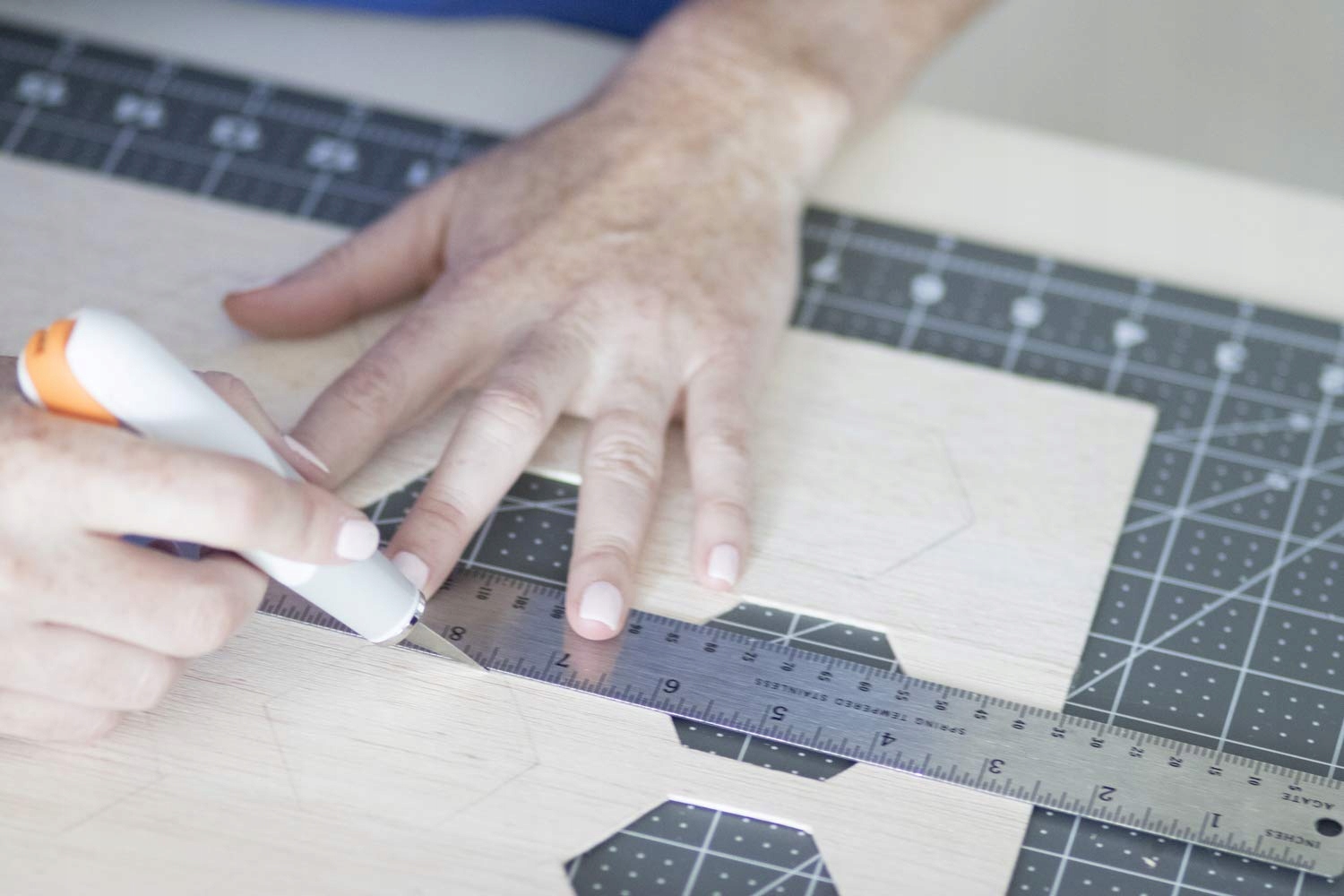 Прочный коврик для резки под режущим устройством с разметкой угла 30°, 45° и 60°°. Идеально подходит для шитья и лоскутного шитья. Легкая резка треугольников и звезд благодаря углам 30°, 45° и 60°. Хорошо подходит для резки дисковым ножом. Быстрое измерение с легко читаемой сеткой в сантиметрах и дюймах. Высокая прочность, самовосстанавливающаяся поверхность, Практическая полка для хранения на стене