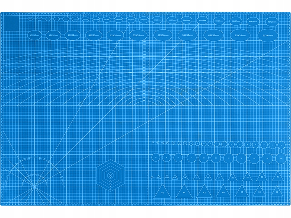 После резки он остается гладким. С обеих сторон имеет слой, на котором напечатана сантиметровая шкала по вертикали и горизонтали, имеются отмеченные углы, транспортиры. , параллельные линии и фигуры.