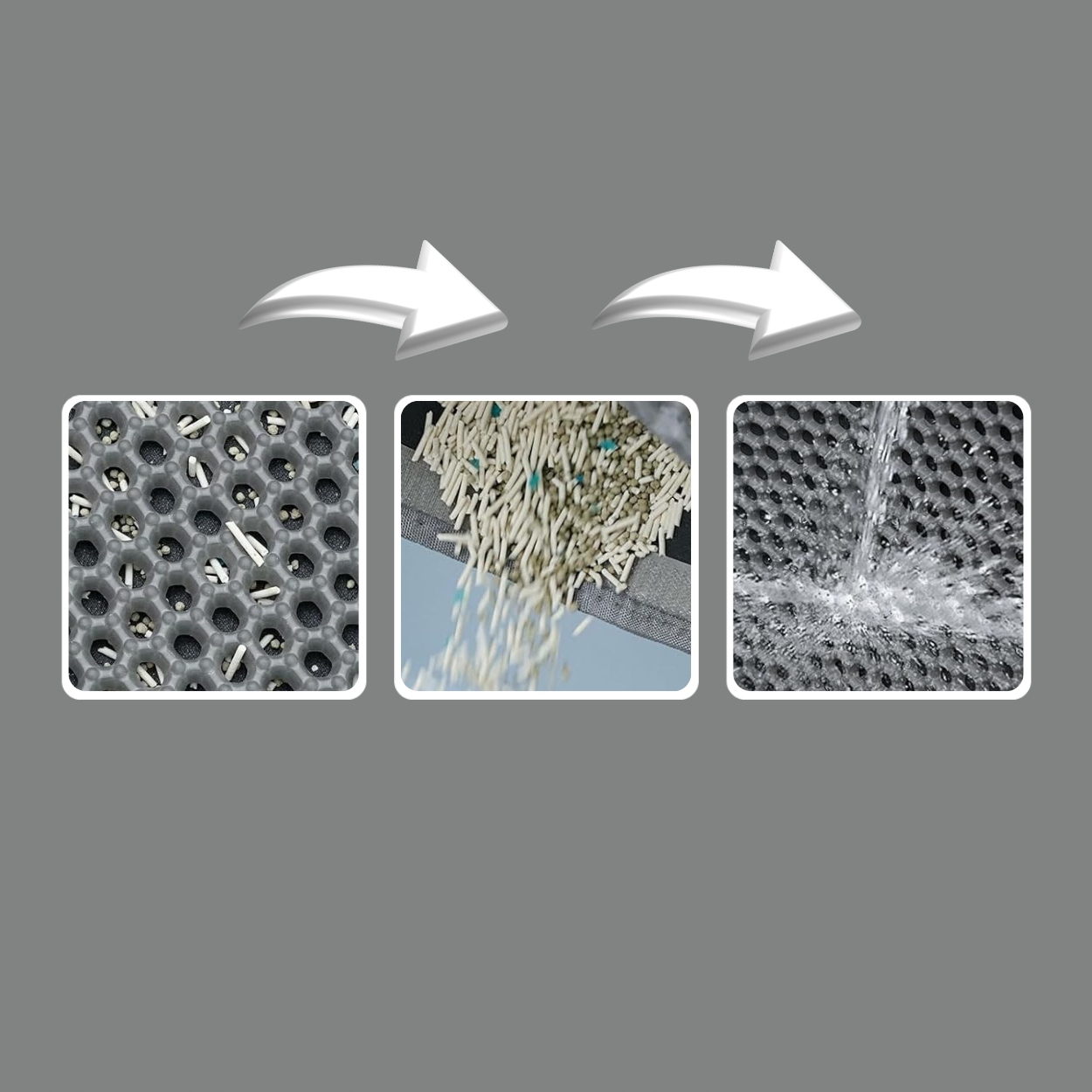 Благодаря двум сложному дизайну, мата эффективно останавливает гравийные кюзеры. Мусор проходит через дыры в форме меда до нижнего слоя, что предотвращает его распространение по всему дому.
