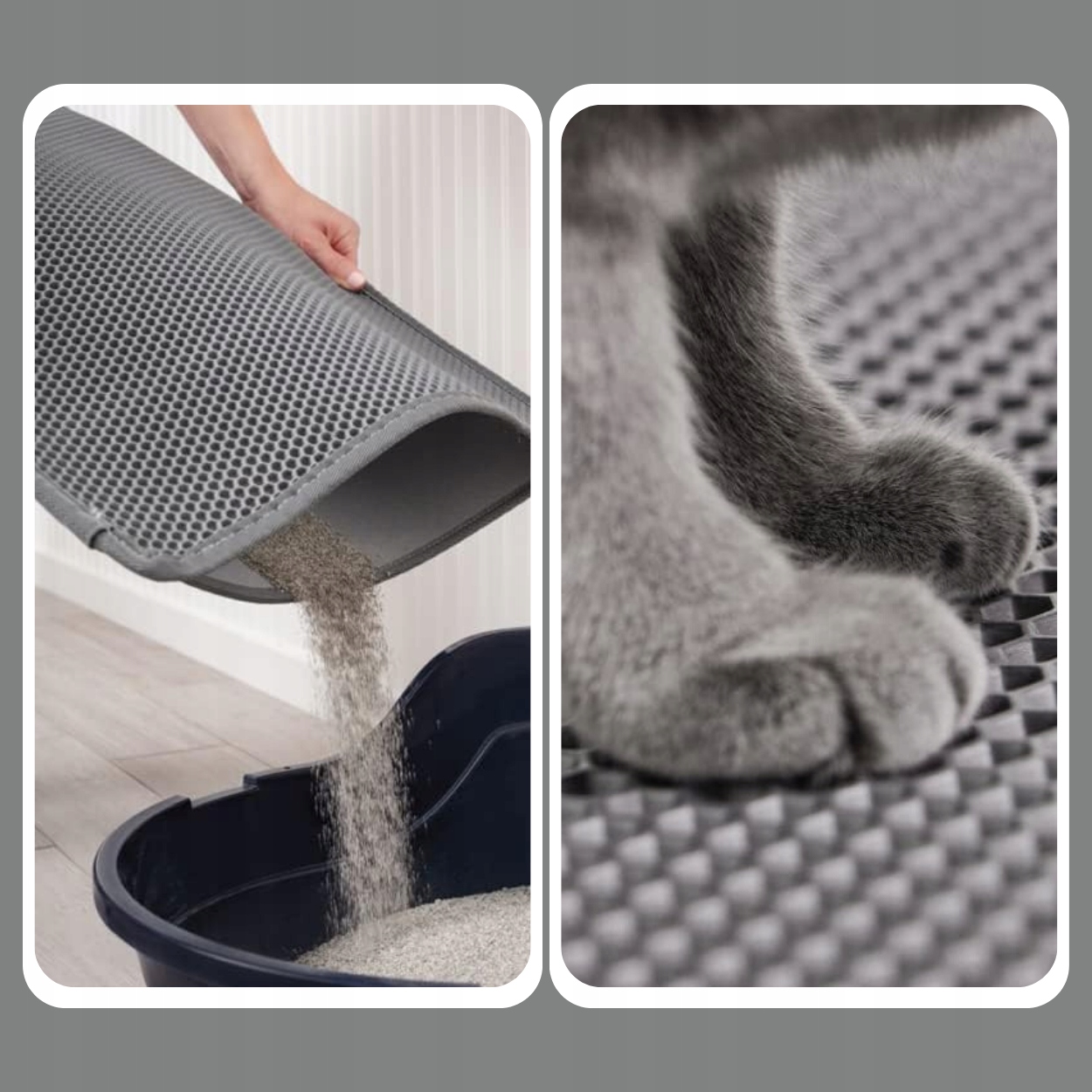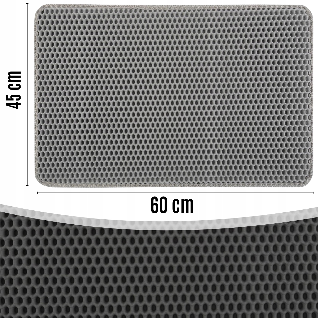 Мат с размерами 45x60 см достаточно большой, чтобы эффективно собирать гравий вокруг ящика для мусора, даже с более оживленными кошками.