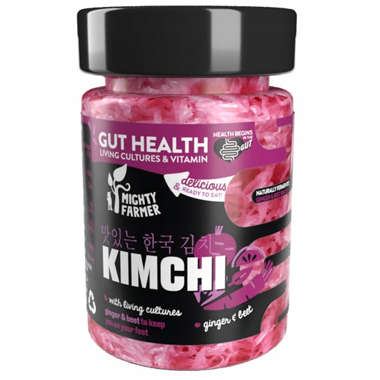 Она имеет прекрасный вкус, усиливает аромат блюд, ценится за низкую калорийность и содержание витаминов С и А, железа и кальция. Кимчи можно есть сырым, в качестве закуски или дополнения к блюдам – например, к мясу или тофу, но оно также является отличным ингредиентом для теплых блюд. Сделано в Португалии. Состав: капуста китайская 44%, свекла 20%, репа 8%, вода, лук репчатый, порей, соль, чеснок, сахар, имбирь сушеный 0,3%, Bacillus coagulans, антиоксидант: аскорбиновая кислота.