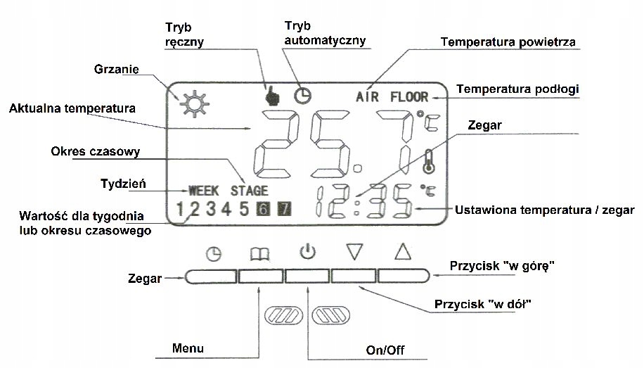 В автоматическом режиме термостат запускает недельную программу (на экране появляется значок режима АВТО, а в ручном режиме вы просто устанавливаете заданную температуру с помощью кнопок вверх/вниз, и термостат поддерживает ее независимо от ранее установленной недельная программа.При работе в автоматическом режиме каждые 5 секунд в верхней части дисплея поочередно отображаются текущий день недели (НЕДЕЛЯ) и текущий период времени (ЭТАП).