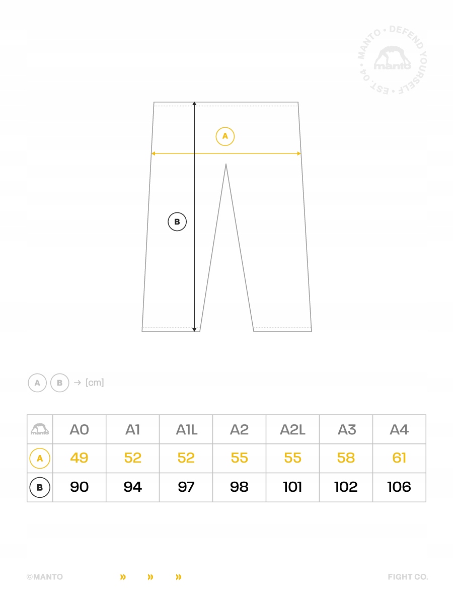 <р> A1 (165–175 см/60–70 кг), вес GI (1,7 кг) <р> A1L (170-180 см/60-70 кг), вес GI (1,6 кг) <р> A2 (175–183 см/70–80 кг), вес GI (1,8 кг) <р> A2L (180–185 см/70–80 кг), вес GI (1,7 кг) <р> A3 (183–195 см/80–95 кг), вес GI (2,0 кг) <р> A4 (195–205 см/95–100+ кг), вес GI (2,1 кг) <р> Внимание! <р> Естественный эффект – уменьшение размеров ЖКТ после нескольких первых стирок в теплой или горячей воде. <р> Изделие имеет усадку примерно 3-5%.
