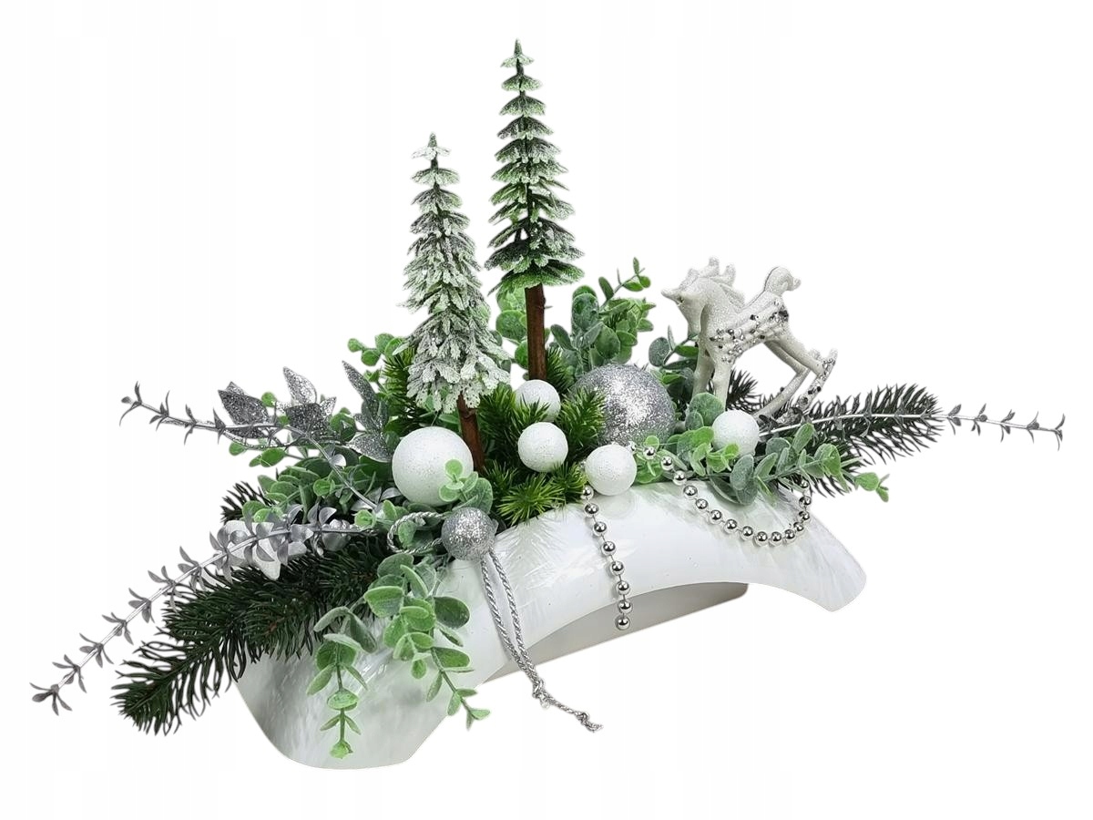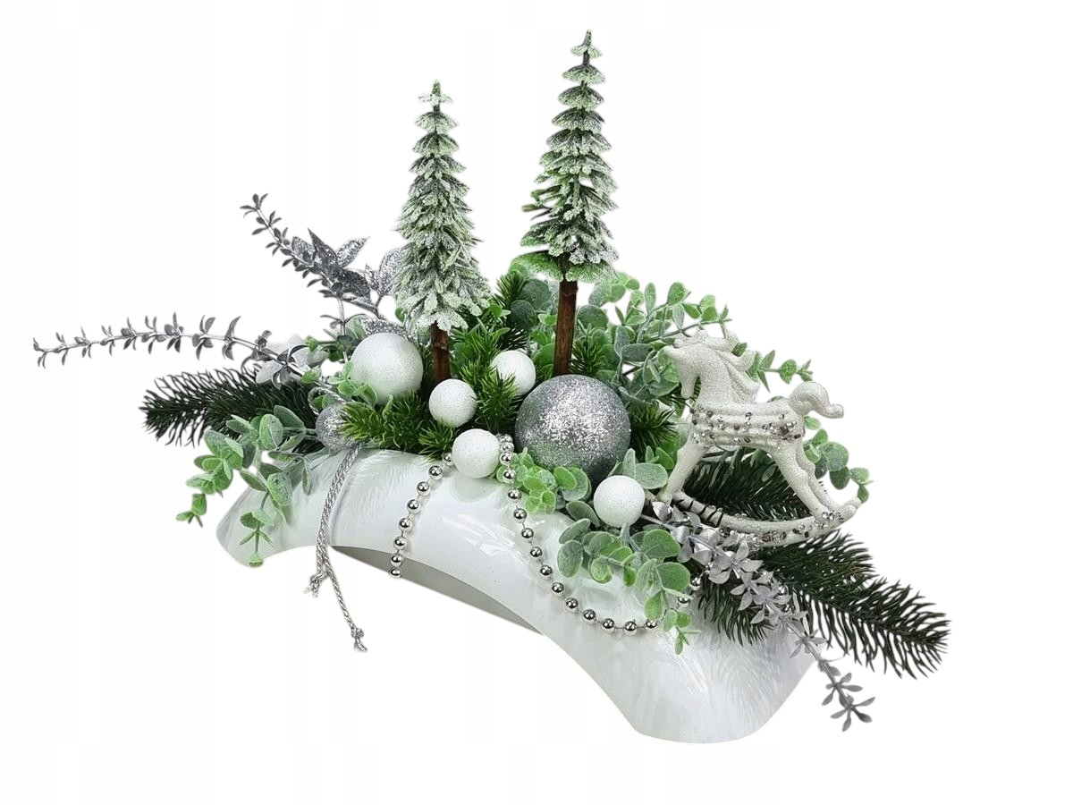 Рождественское украшение с елками, игрушками и лошадкой-качалкой. Композиция в прочной белой икебане. Все выглядит великолепно.