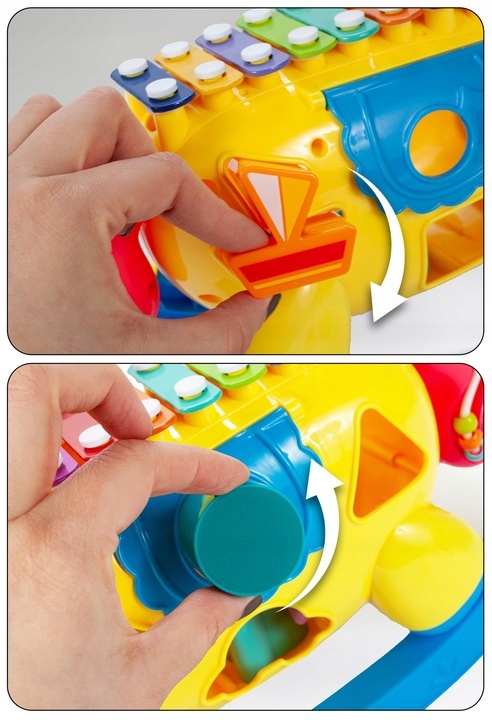 Игрушка сочетает в себе множество элементов, развивающих различные навыки. Сортировщик с кубиками геометрических фигур учит распознавать форму и цвет. Тарелки и погремушки стимулируют слух и координацию движений. Кроме того, свет и звуки задействуют чувства и стимулируют воображение малыша.