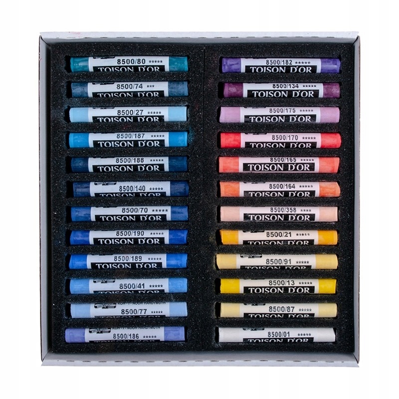 Сухая пастель TOISON D'OR изготовлена из ингредиентов высочайшего качества. Для их изготовления использовали очень прочный и однородный пигмент и очень мелко измельченные натуральные вещества на основе карбоната кальция, минерала кальцита или мела. Они очень нежные, поэтому хорошо растушевываются. При рисовании пастелью рекомендуется использовать фактурную бумагу, так как они соединяются с поверхностью только механически. После окончания работу следует закрепить закрепителем, чтобы предотвратить дальнейшее размазывание работы.