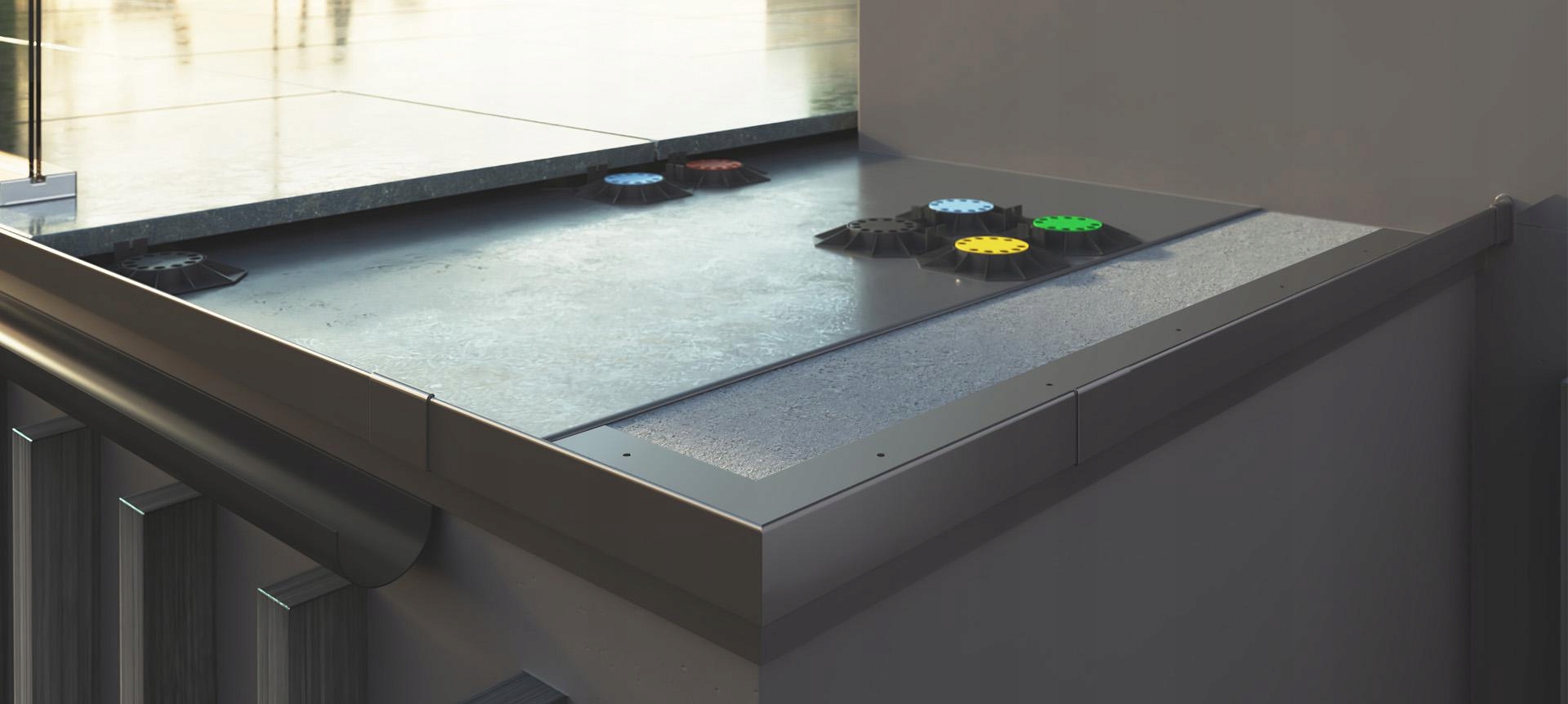 - Высокая жесткость профиля позволяет правильно его установить, обеспечивая эффективный дренаж пола балкона/террасы без возможности скопления воды по краям пола.