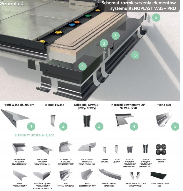 Стеновые отбойники для карнизного профиля Renoplast W35+ представляют собой пластиковый элемент, монтируемый между зданием стена и боковой профиль.