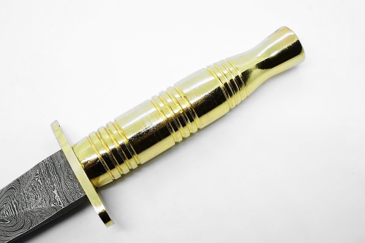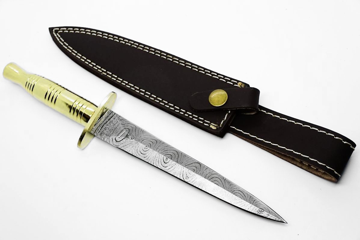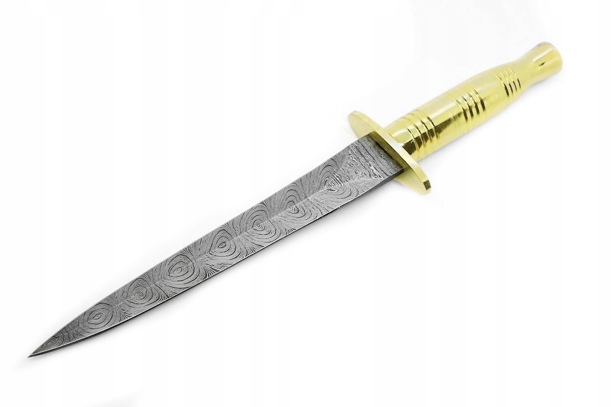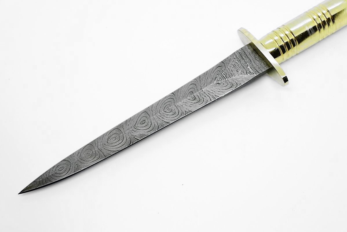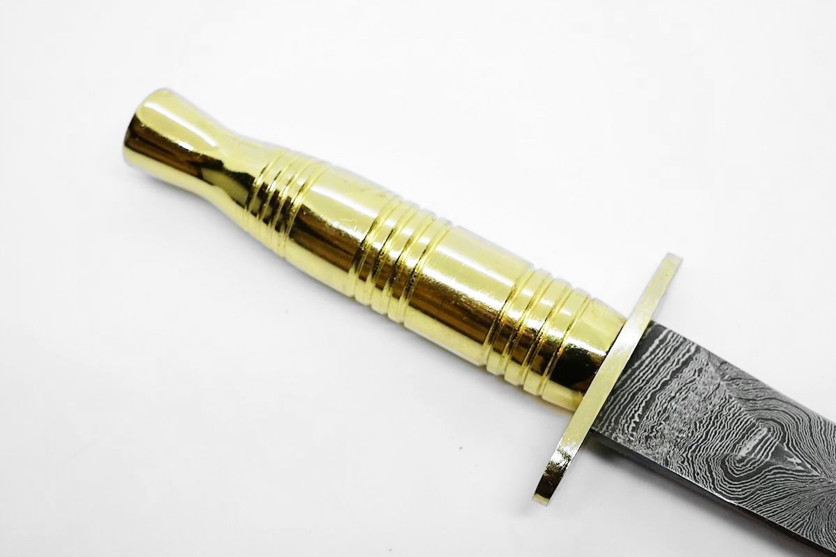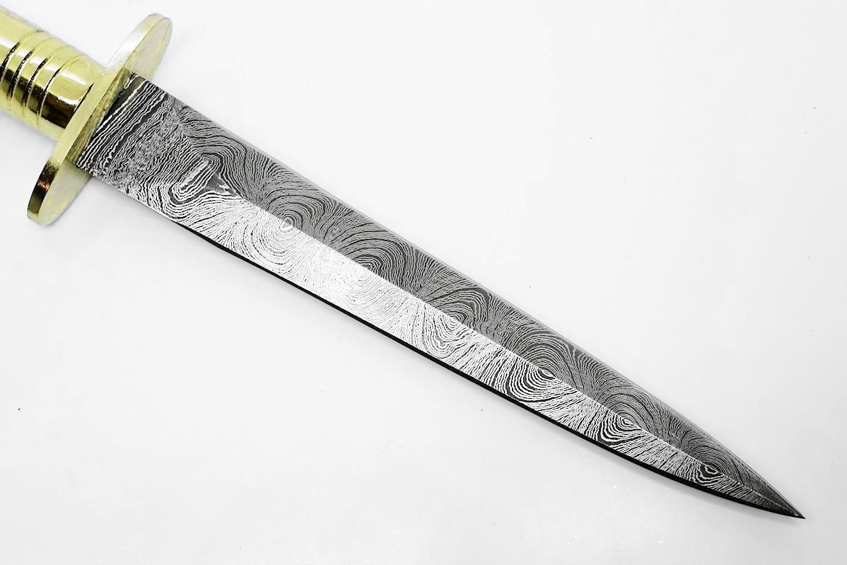 Это большой нож-кинжал, вдохновленный кинжалами британских спецназовцев SAS. Клинок изготовлен из дамасской стали.
