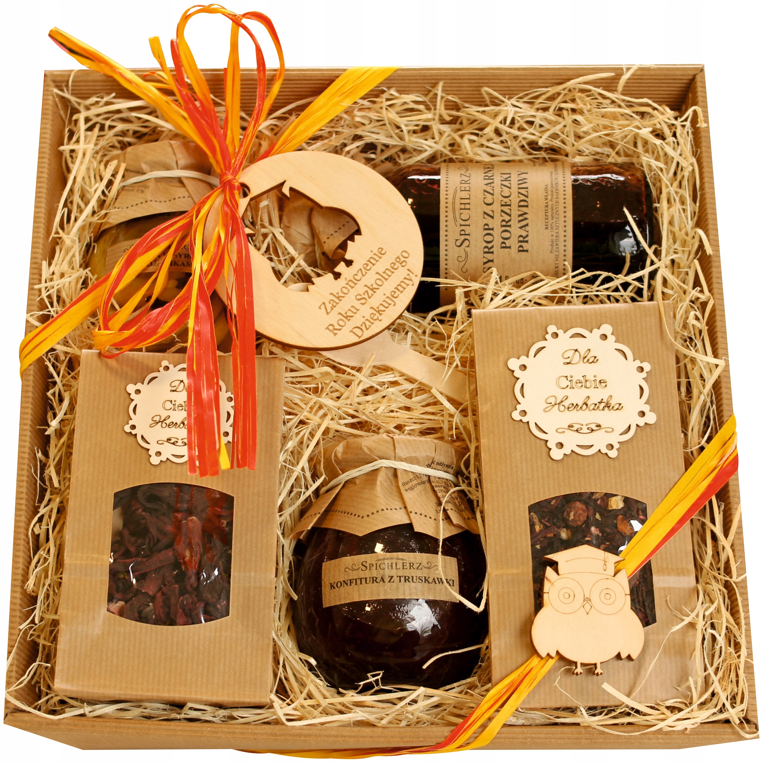Поверьте, мы заботимся о мельчайших деталях - доказательство вы можете увидеть на фото ниже. Деревянная сова и табличка с надписью: «Окончание учебного года!», исключительно обогащает внешний вид корзины, а главное подчеркивает, по какому случаю и для кого она предназначена. подготовленная корзина. Благодаря этому вы получите прекрасный подарок, который, несомненно, очарует каждого учителя :)