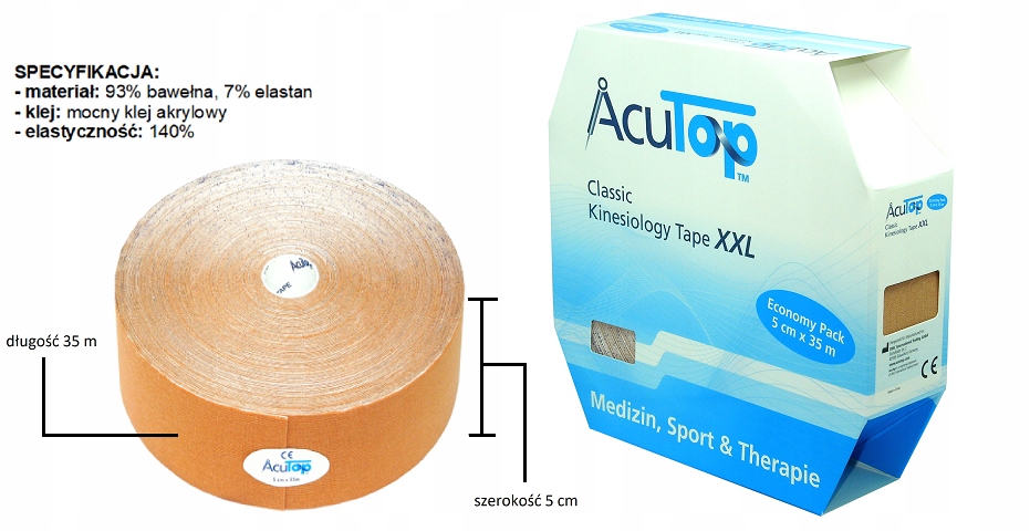 Длинный 35-метровый рулон AcuTop — экономичное решение для людей, которые часто используют кинезиотейпирование. Идеально подходит для реабилитационных центров, где пластыри используются в больших масштабах. Один такой рулон эквивалентен семи отдельным 5-метровым кускам, а цена его гораздо привлекательнее. Его высокая эффективность позволяет использовать множество приложений и сэкономить 30 % затрат.