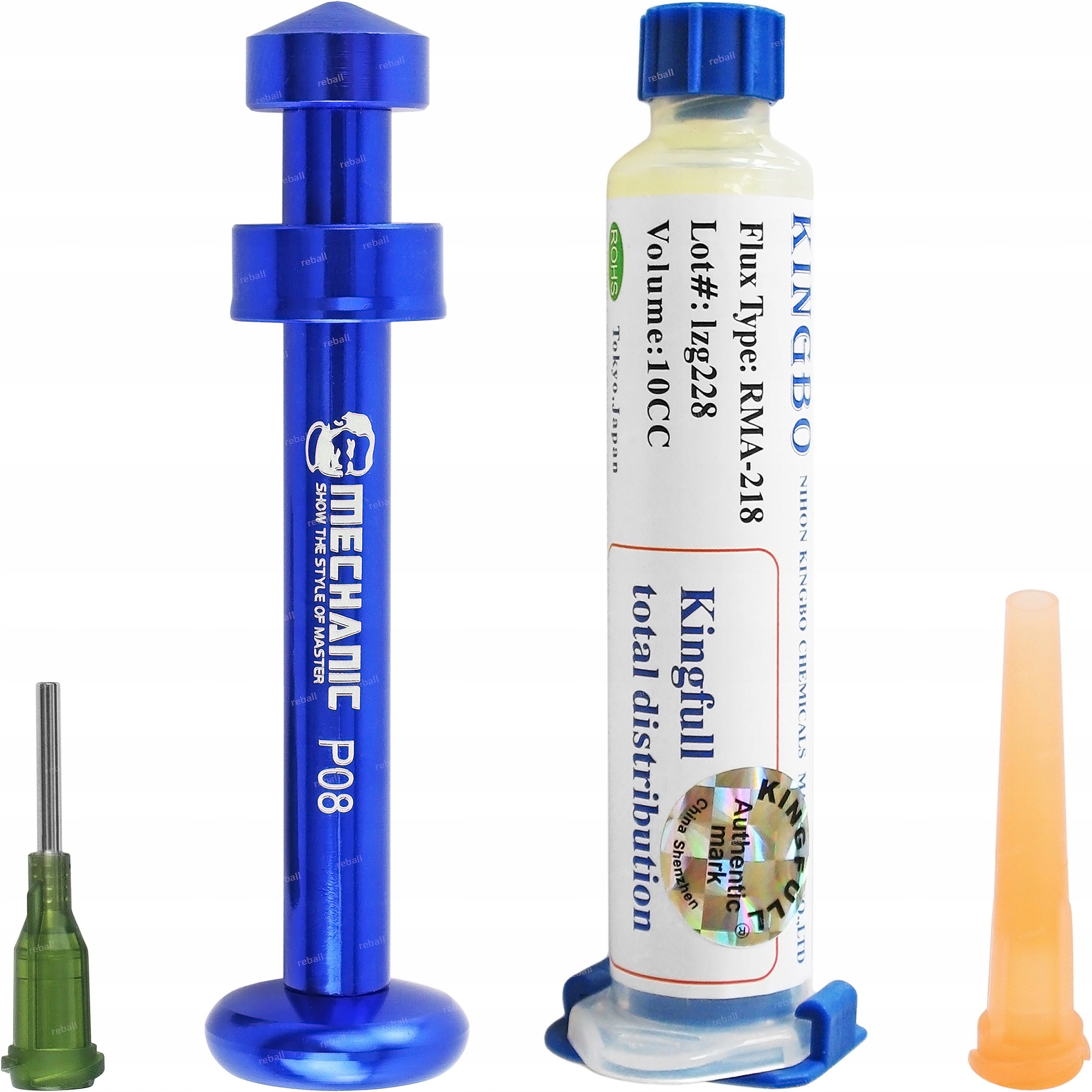 Комплектация: высококлассный флюс KINGBO RMA-218 10г с фирменным отжимателем Mechanic P08 и двумя иглами.