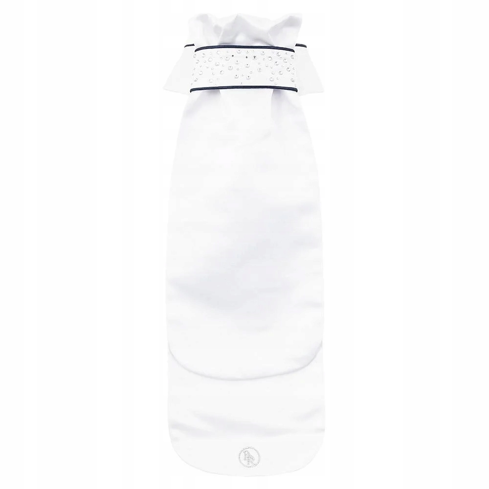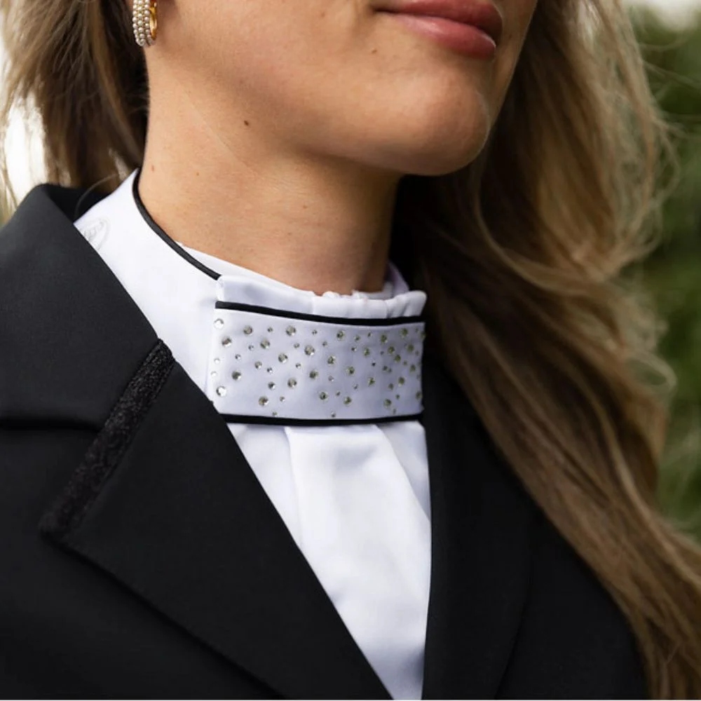 был украшен блестящими кристаллами, тонкой отделкой в контрастном цвете и элегантной вышивке логотипа BR в серебре. Он не требует складывания или использования защитного штифта - его практическое крепление липучки сзади позволяет быстро и удобно прикрепить рубашку или конкурентную блузку к воротнику.
