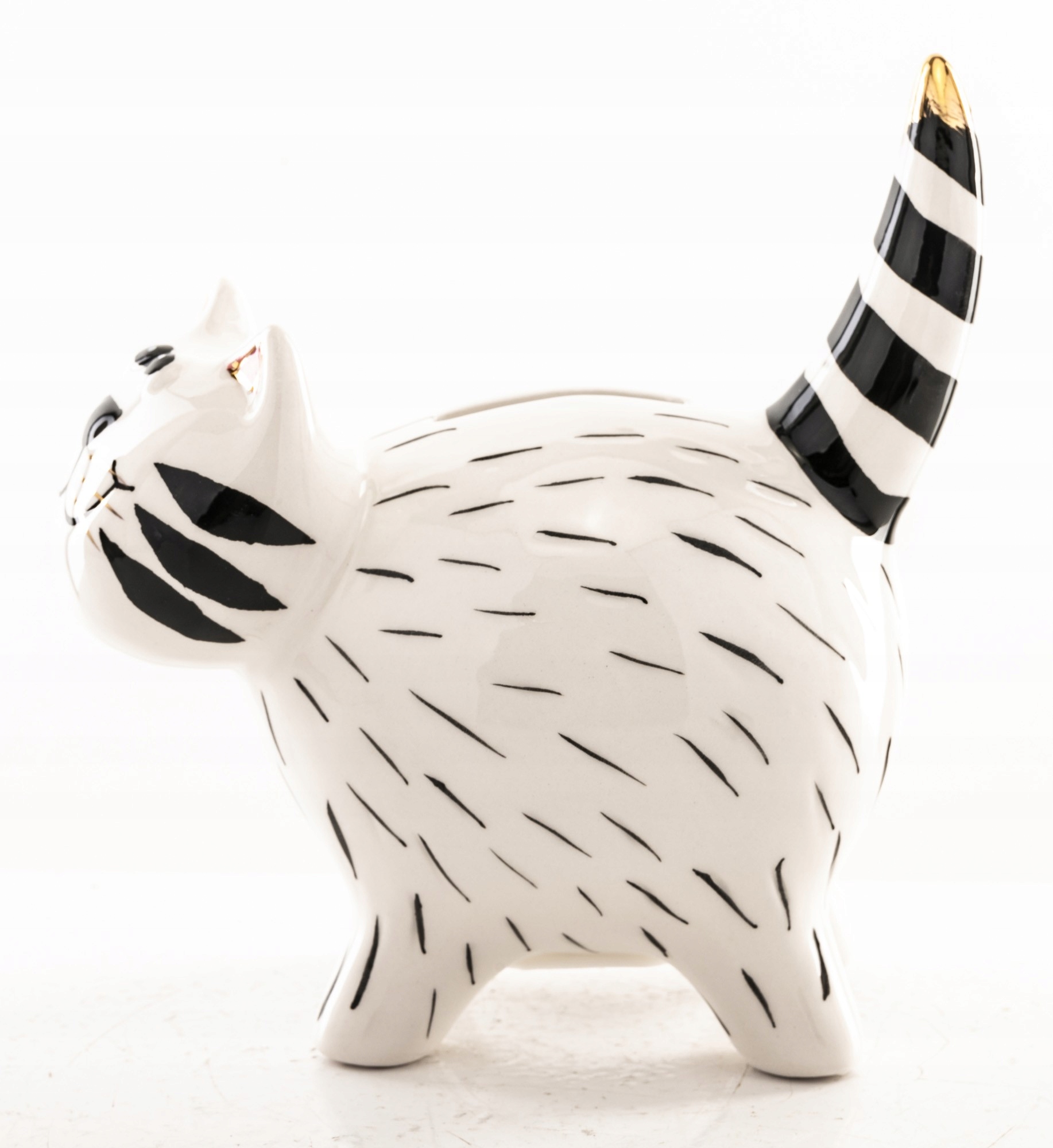 Забавное выражение мордочки, контрастные полоски и золотые элементы придают копилке неповторимый стиль, привлекающий внимание в любом интерьере.