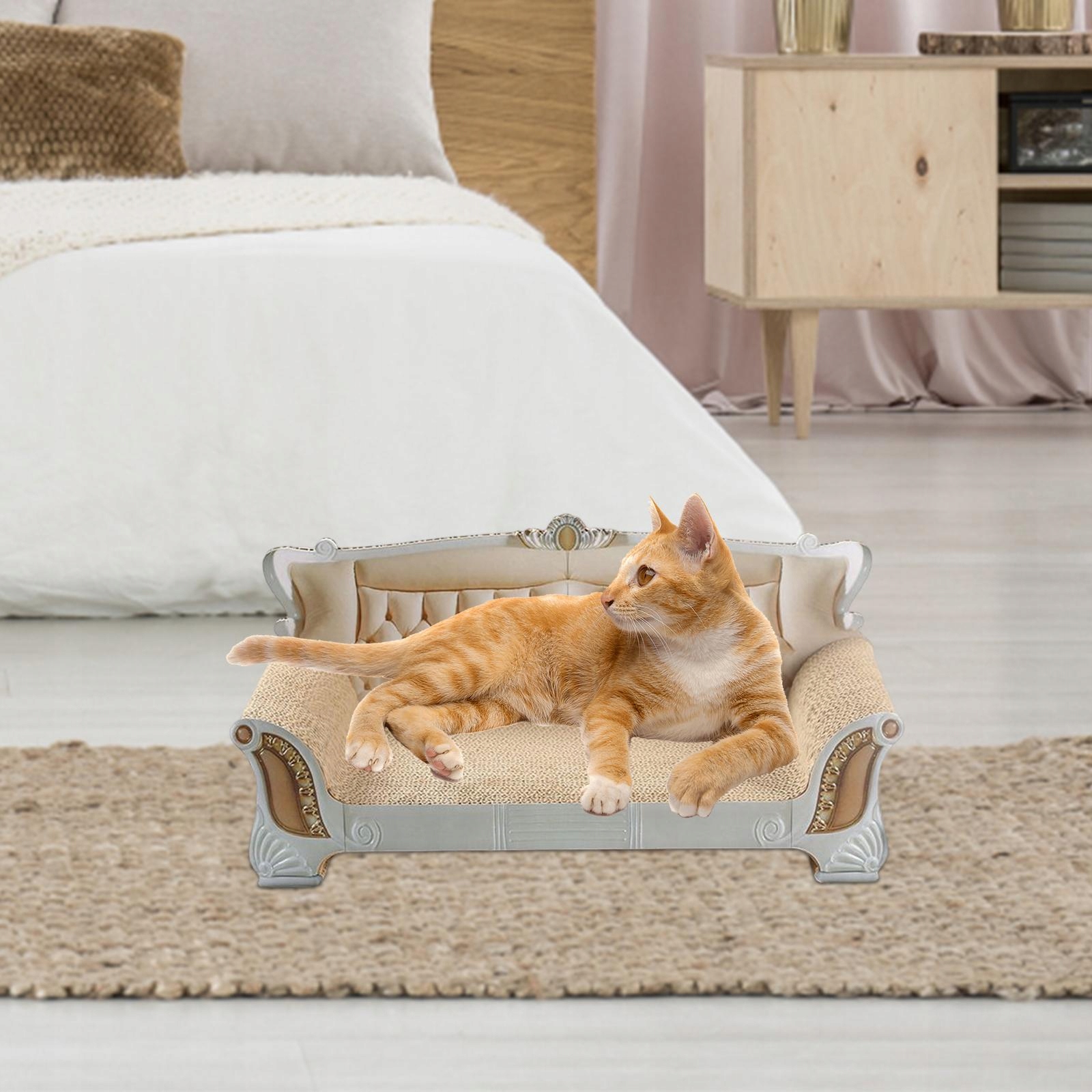 Материал: Диван с царапин кошки изготовлен из гофрированного картона, устойчивого к износу, царапины, твердых и постоянных в использовании.