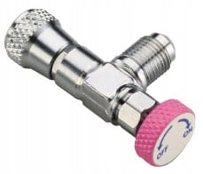 Клапан угловой для заправки хладагента и воздуха установки кондиционирования. Клапан имеет подвижный толкатель, открывающий сервисный клапан. Благодаря его использованию утечка хладагента из установки сводится к минимуму.