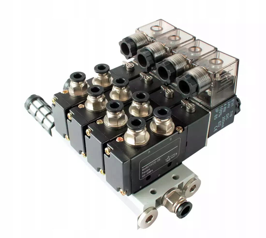 Пневматический клапанный остров, состоящий из 4 электромагнитных клапанов с функцией 5/2, катушки 24 В постоянного тока и вилки со светодиодом и пневматических аксессуаров.