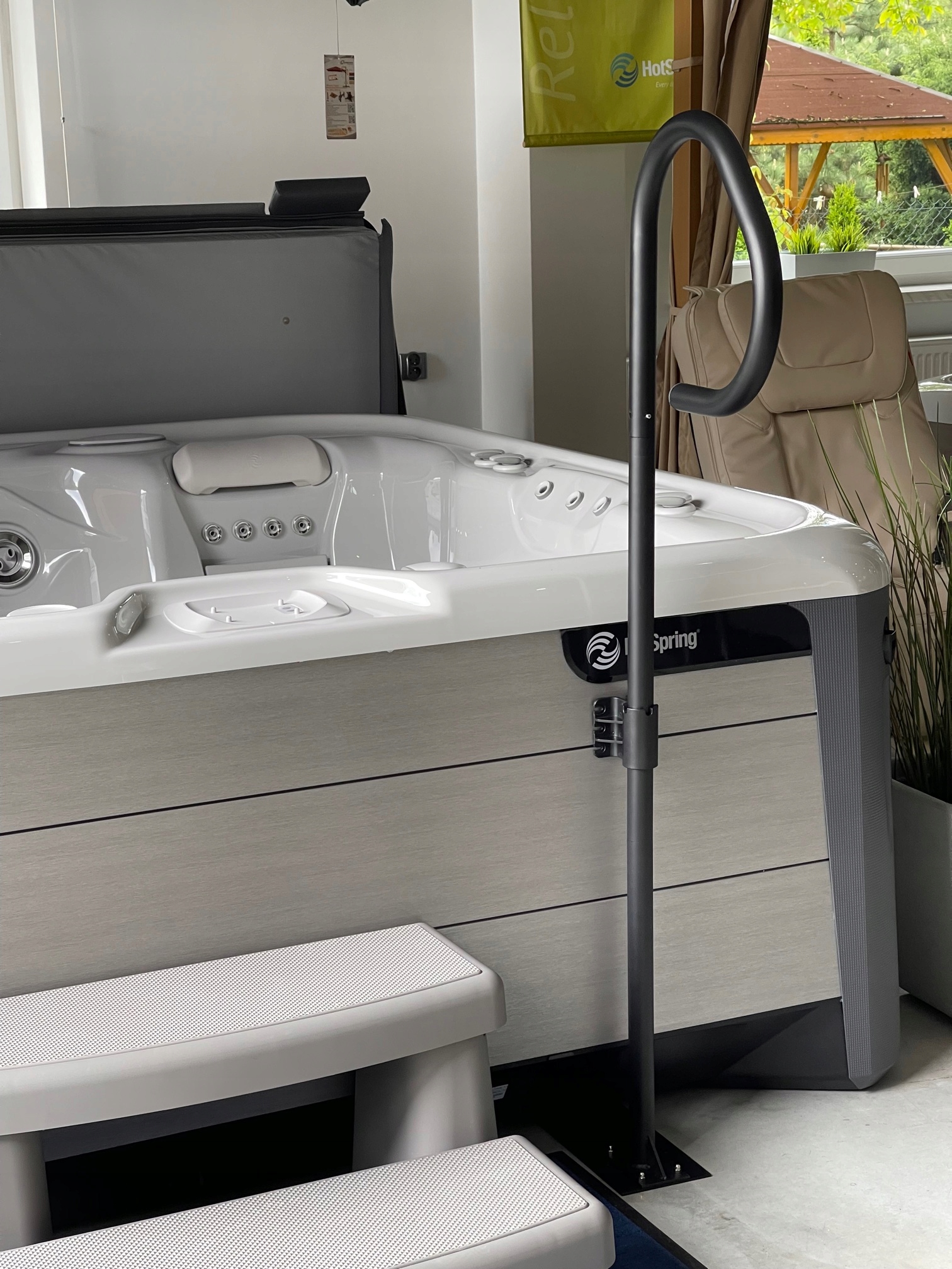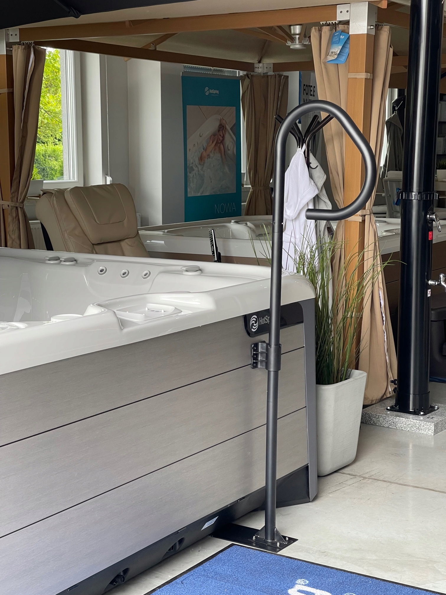 Универсальная поручка для спа -ванны различные бренды с максимальной высотой около 150 см. Изготовлен из алюминия, изготовленного из порошка, благодаря которого он устойчив к внешним погодным условиям.