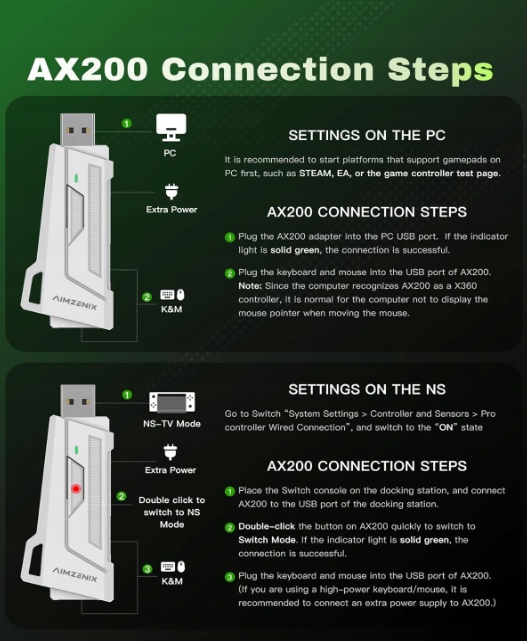- Подходит для Nintendo Switch: AX200 поддерживает соединение с NS с использованием адаптера OTG. Просто дважды -щелкните кнопку AX200, чтобы переключиться в режим NS одновременно, или вы можете установить ее в режим NS, используя приложение