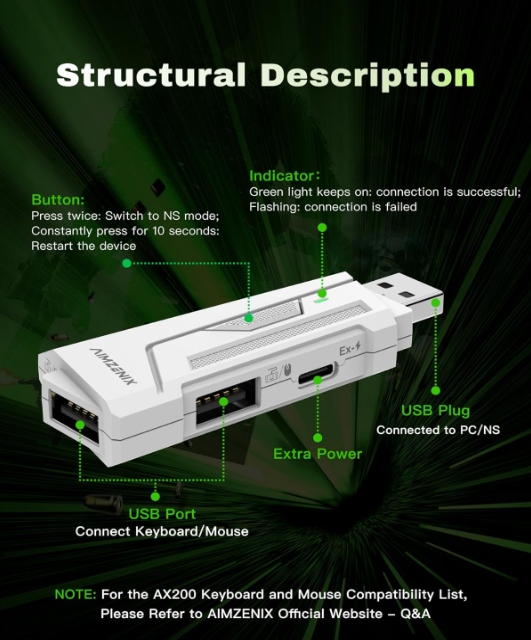- Разработано только для игр для ПК: AX200 преобразует входные данные мышей и клавиатуры для контроллера x360, обеспечивая гибкий контроль над клавиатурой и мышей и поддерживая прицел контроллера в играх FPS/TPS, что обеспечивает улучшение геймплея