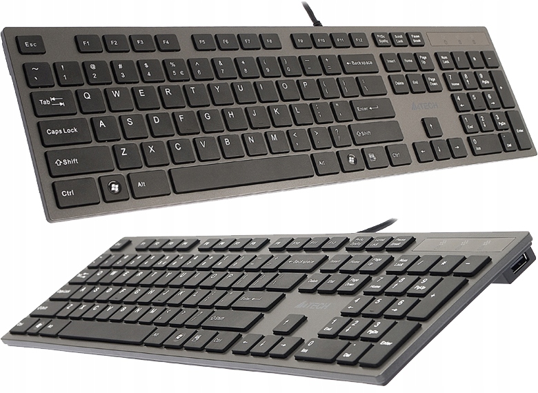 Сверхплоская и компактная клавиатура в предложении A4Techa KV-300H в графитовом цвете, как на фотографиях.