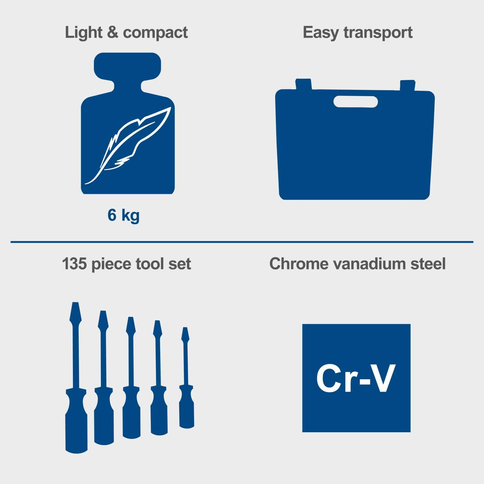 Scheppach TB170 - это набор инструментов, содержащих 135 частей, идеально подходящих для различных применений дома, на строительной площадке, на семинаре и во время кемпинга. Инструменты изготовлены из прочной хромированной стали, которая обеспечивает их долговечность. Все элементы хорошо организованы и легко доступны в сплошном, закрытом чемодане АБС, который благодаря усиленным углам подходит для более сложных условий труда и для мобильного использования