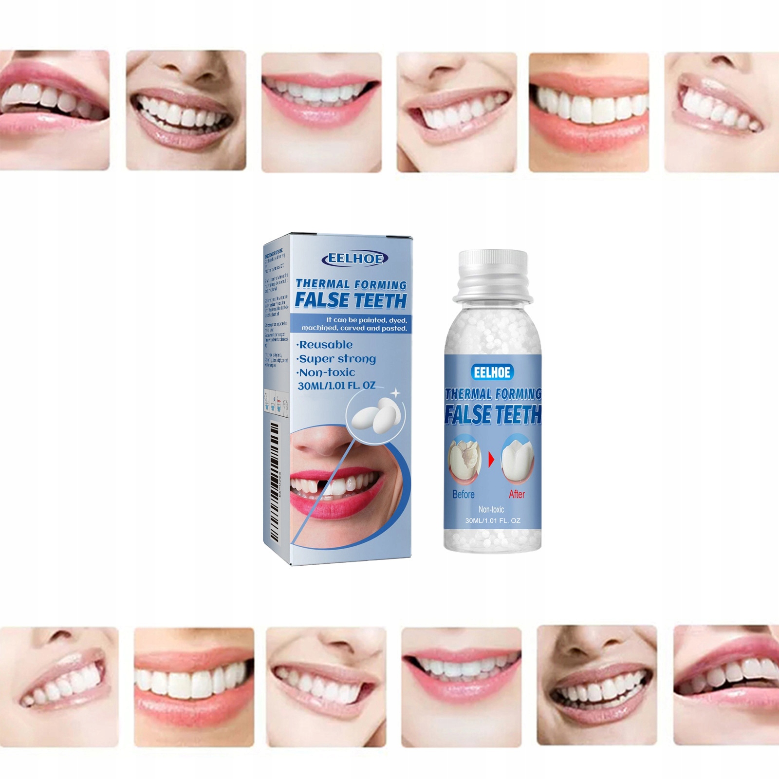 Изделие изготовлено из высококачественного и полностью безопасного материала. Вы можете быть уверены в его использовании, а его форму/размер можно отрегулировать именно так, как вы хотите, просто залив кипяток на несколько минут. Заменить зубы довольно легко, и скоро этого будет достаточно, чтобы вы снова улыбались