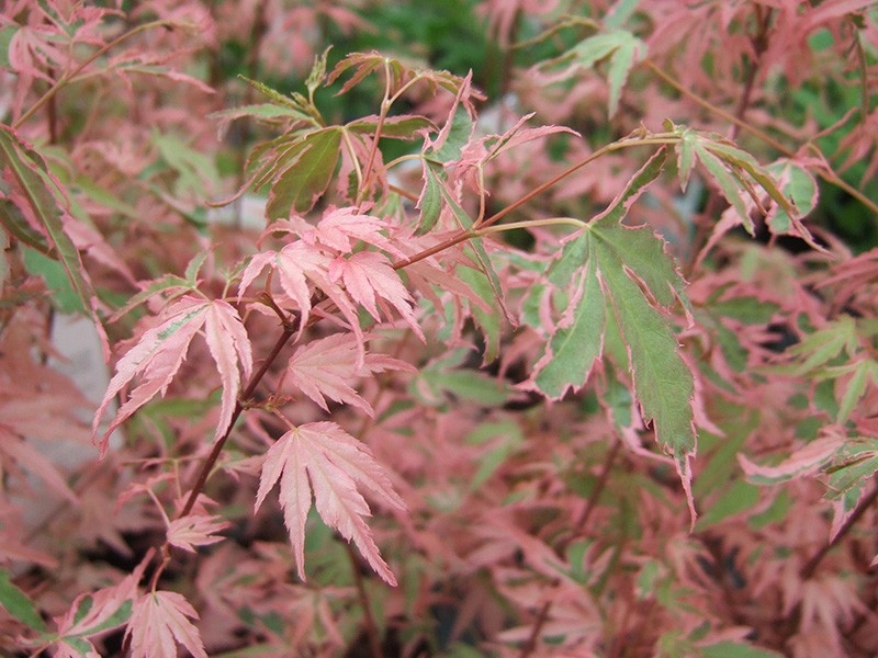 Acer palmatum Taylor – разновидность кленовой пальмы с ослепительно-розовыми листьями. Как будто этого мало, молодые приросты переливаются тремя цветами – зеленым, розовым и кремовым. Цвет сохраняется до осени, привлекая внимание.