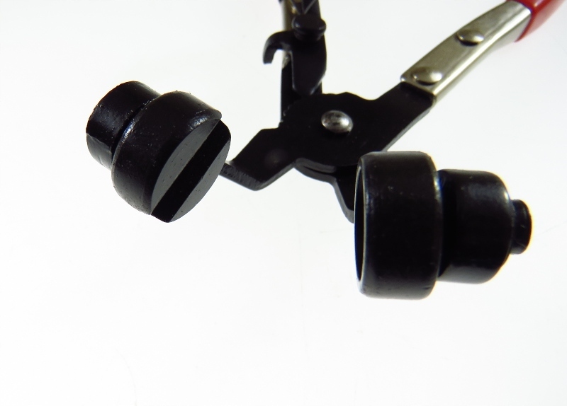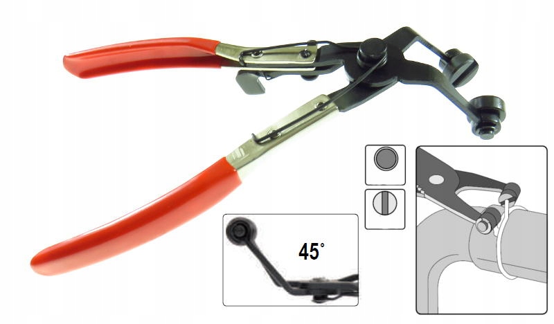Изогнутые плоскогубцы предназначены для открытия или затягивания распорных хомутов. Идеально подходит для хомутов на резиновых шлангах в автомобилях (системы охлаждения, топлива, кондиционирования). Угол наклона плоскогубцев 45°. Они оснащены храповым замком.