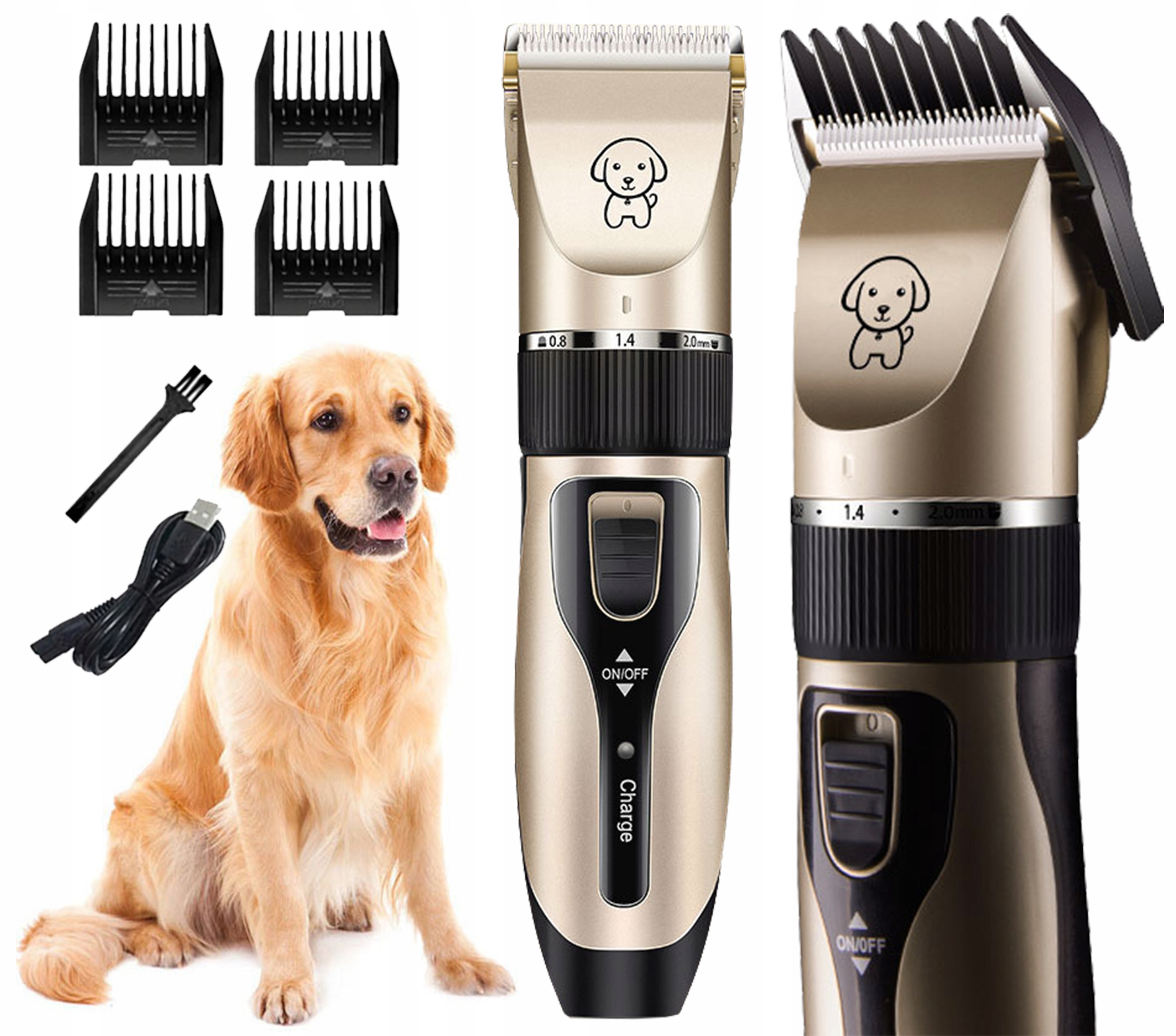 - Машинка для стрижки, аккумулятор, щетка, оливковое масло и USB-кабель, 4 расчески.