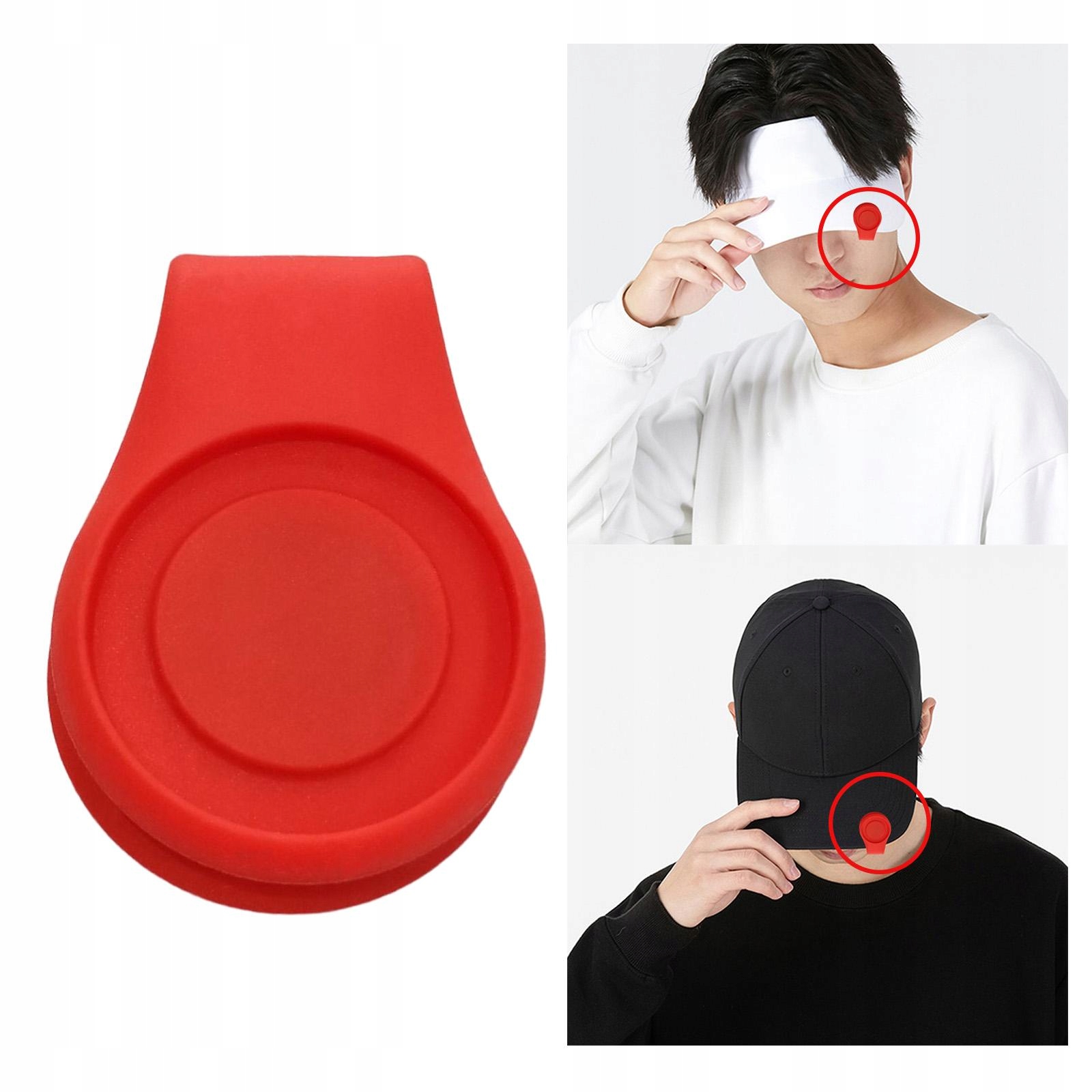 Klips do oznaczania piłek golfowych do mocowania na czapce. Odpinany silikonowy wizjer. Czerwony