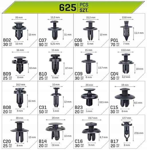 - Набор из 625 ELEMENTS, включающий в себя 16 самых популярных типоразмеров клипс и крепежных соединителей.
