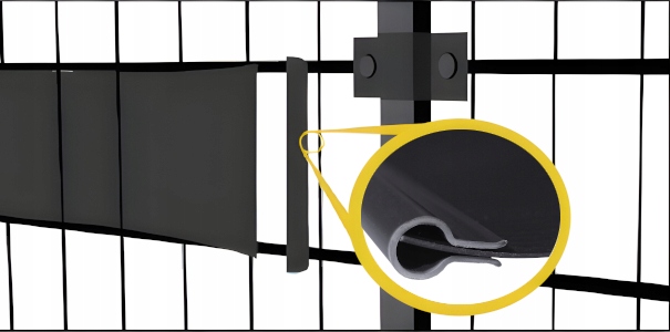 Зажимы позволяют монтировать узкие ленты ограждения толщиной 4,75 см плотностью 1200 г/м² к пролетам панельных заборов и перил.