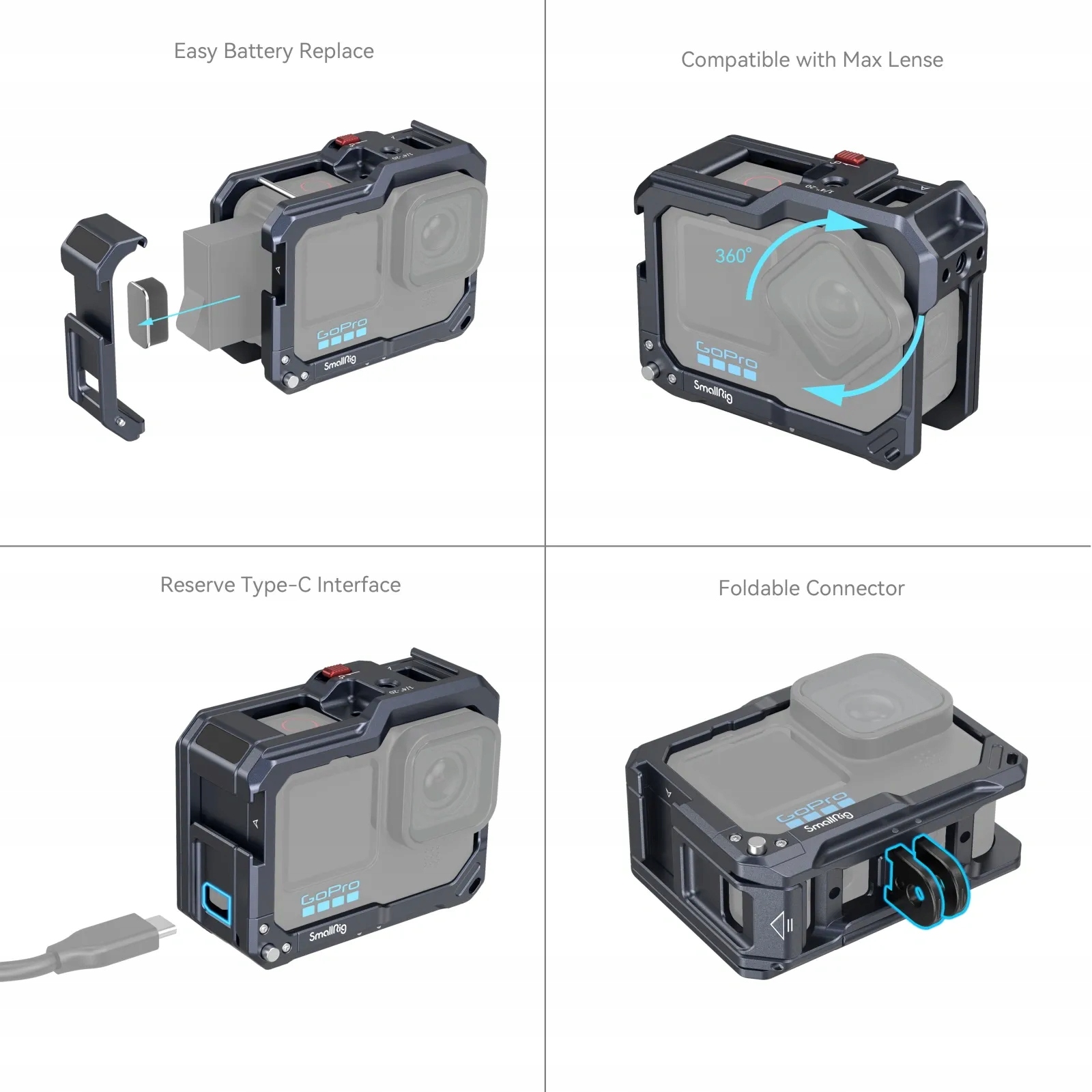 Корпус для камеры с двумя потайными ножками скрытого типа. Имеют один держатель для держателей микрофонов, светодиодных ламп и т. д. В нижней части клетки имеется складное крепление, совместимое со стандартом GoPro. Блок питания с резьбой 1/4 дюйма позволяет напрямую подключать клетку для камеры GoPro Hero 9 к подставкам других устройств, таких как монопод, штанга и т. д.