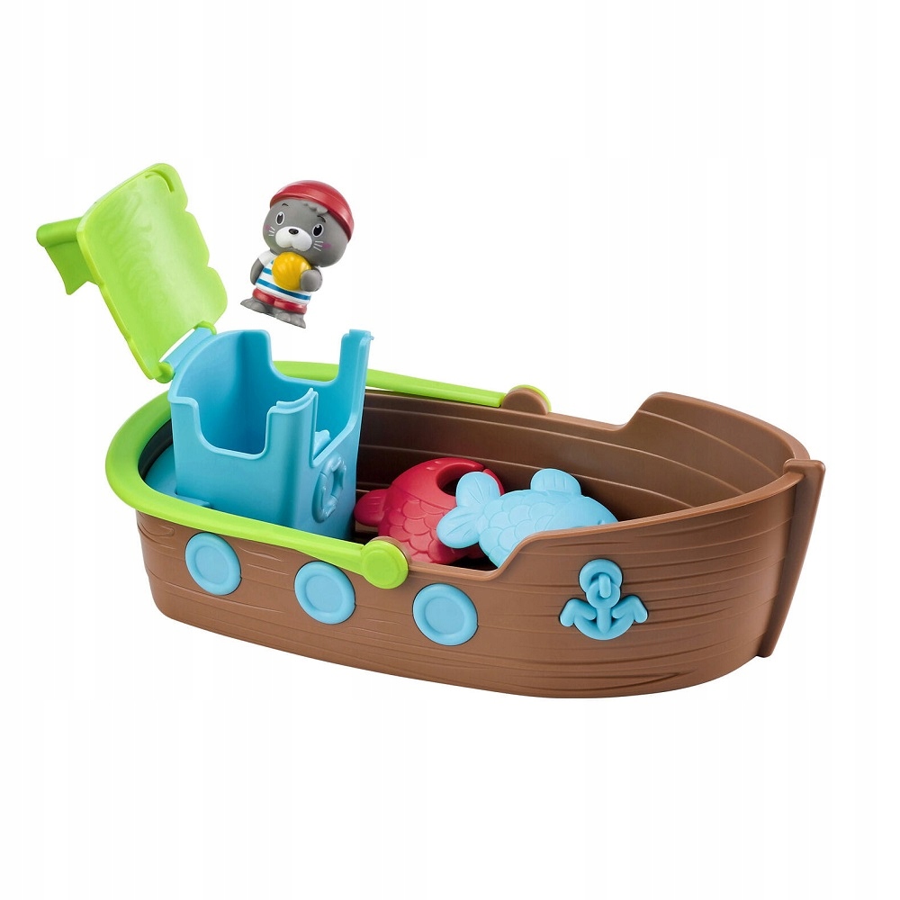 В набор «Klorofil Fishing Boat» входят: большая лодка с ручкой, рыбацкая лодка с удочкой, парусник с парусом, 3 рыбки и питомец-морж Мало.