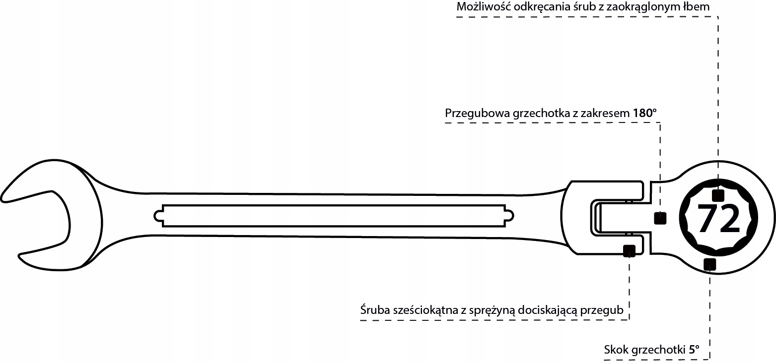 Высококачественный комбинированный ключ из хромованадиевой стали, устойчивый к повреждениям и коррозии. Ключ имеет проверенный реечный механизм - 72 зубца, обеспечивающий точный ход ключа. Небольшие размеры и шарнирная трещотка ключа делают его удачной заменой обычной трещотки в труднодоступных местах. Все храповые кольца рожковых ключей оснащены насадкой, позволяющей выкрутить винт даже с поврежденной головкой.
