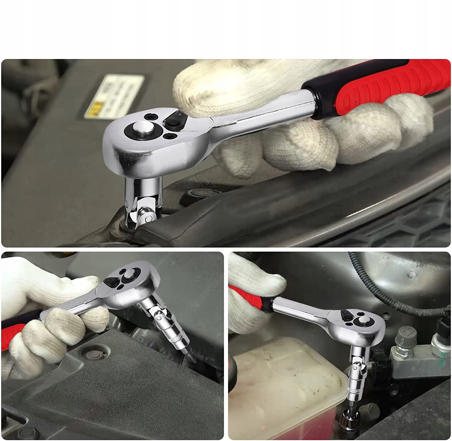 В комплект входят множество головок, насадки-отвертки, удлинители (в том числе гибкий), 2 вида ручек — отверточная и продольная, карданный шарнир, переходник и трещотка с переключателем, позволяющая быстро и легко менять направление вращения. вращение. Каждый из удлинителей, ручек, храпового и карданного шарнира оснащен шариком, который предотвращает выпадение прикрепленной головки - это повышает эффективность работы, повышает комфорт и безопасность, ни одна головка не выпадет во время работы.