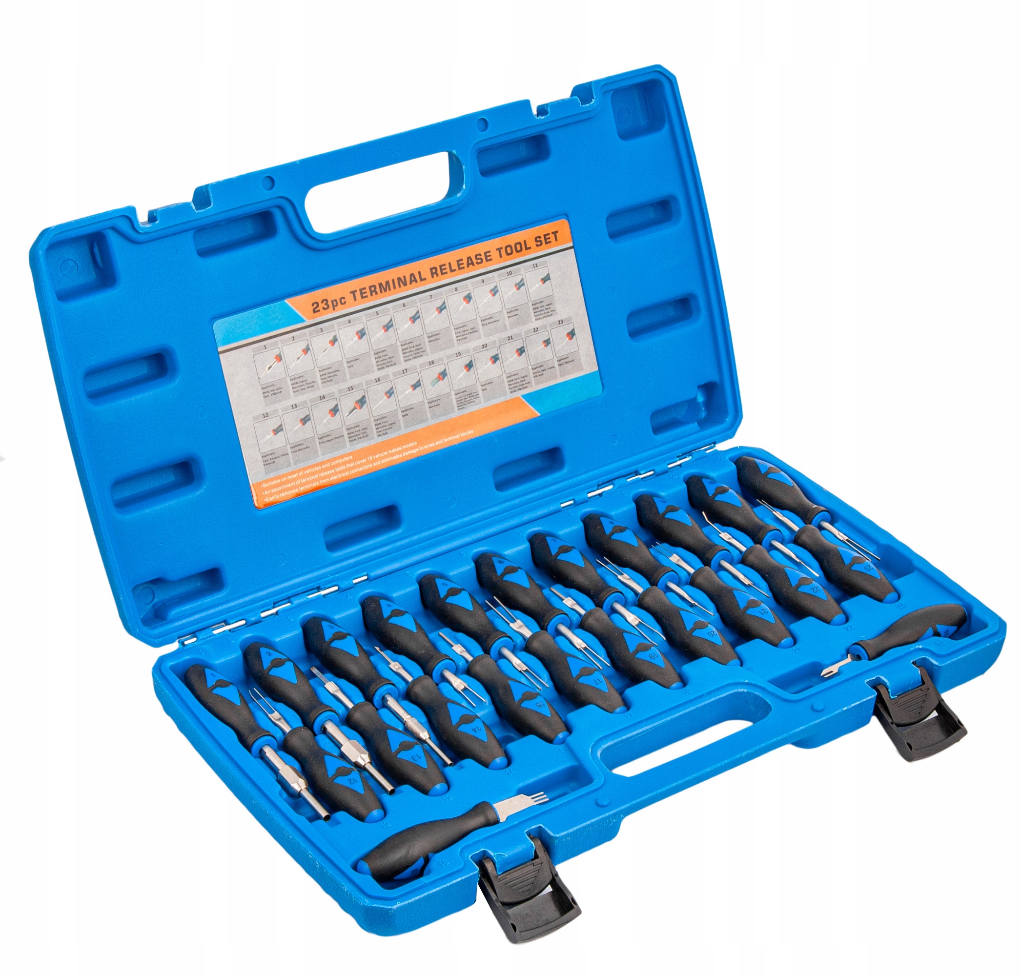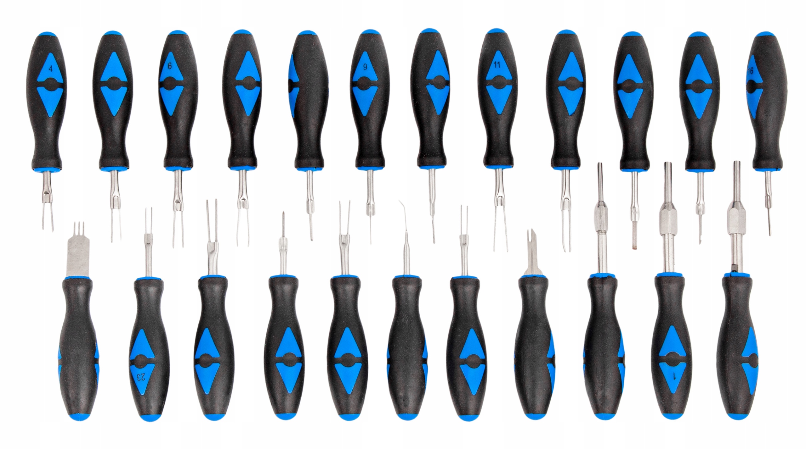 Набор для разъединения всех типов контактов в электросистемах автомобилей. Для работы с электрическими разъемами и разборки плоских разъемов без их повреждения. Универсальный набор, содержащий прецизионные устройства для всех круглых и плоских вилок питания, а также вилок, используемых в датчиках, кондиционерах, ABS, аудиосистемах и т. д.