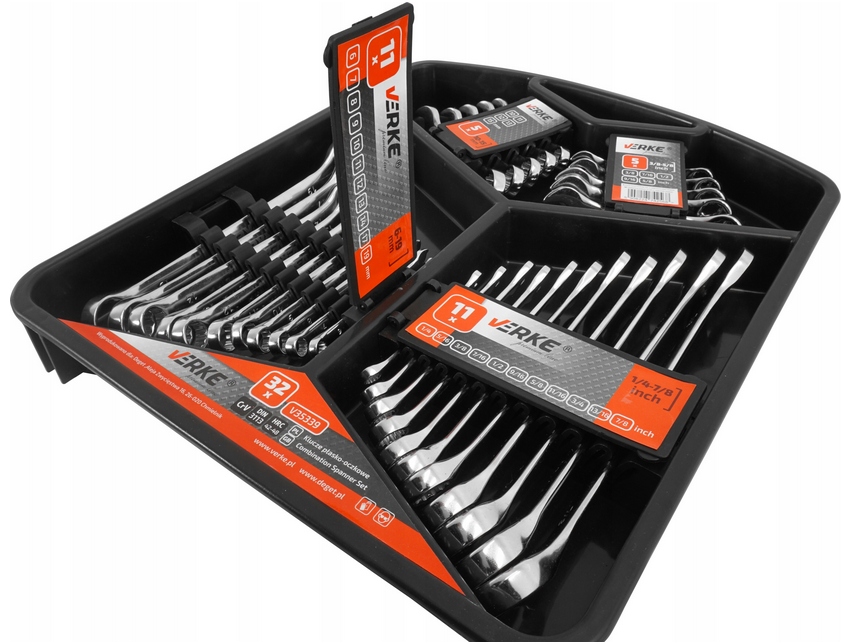 КЛЮЧИ КОМБИНИРОВАННЫЕ МЕТРИЧЕСКИЕ И ДЮЙМОВЫЕ, 32 ШТ. НАБОР КАССЕТ VERKE ПРЕМИУМ 6–19 ММ