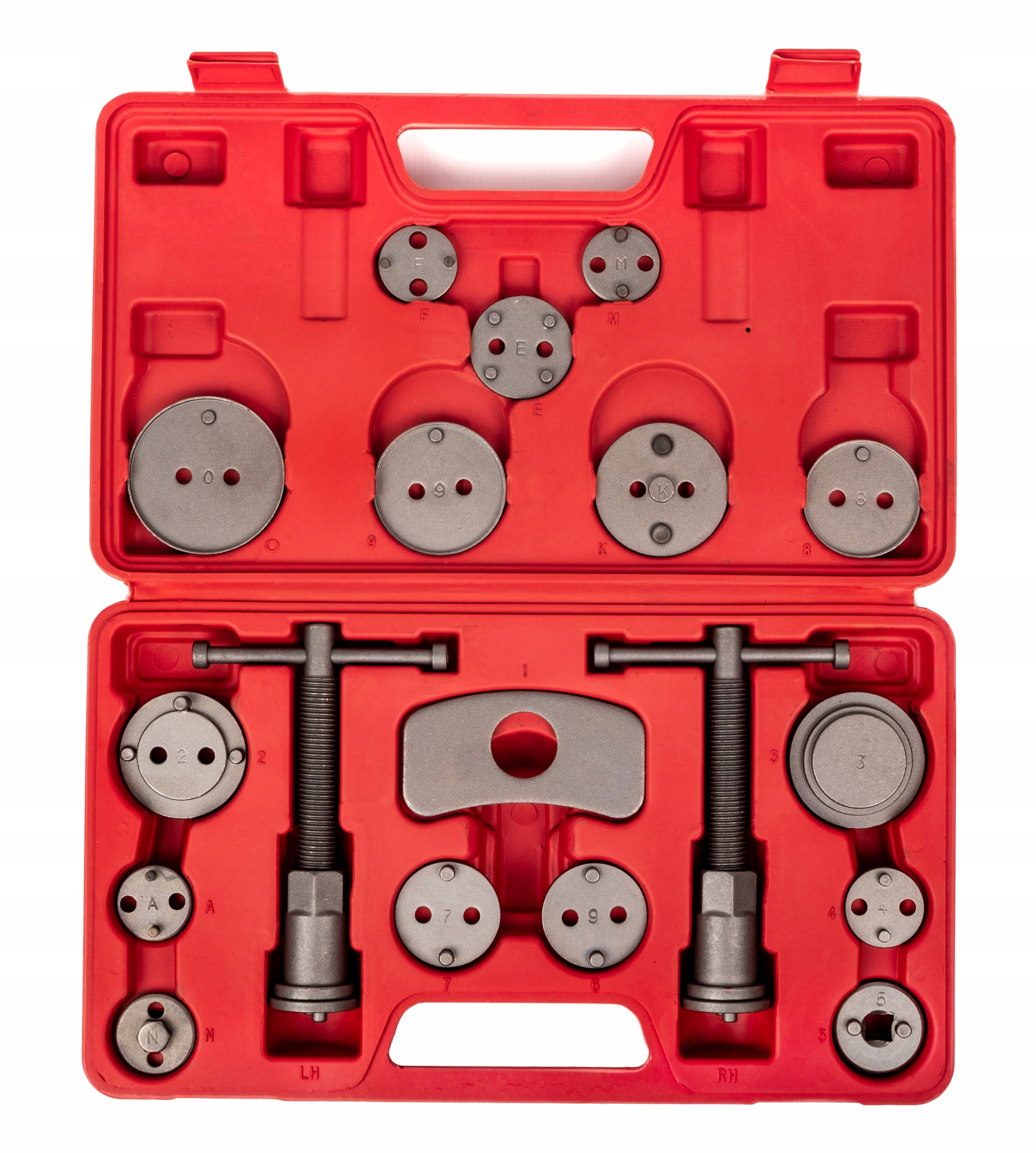Комплект предназначен для втягивания (прессования) поршней в цилиндрах тормозной системы. Необходим при ремонте автомобилей, оснащенных дисковыми тормозами.