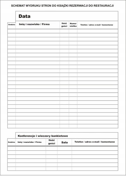 Мы предлагаем Вам Книгу бронирования, которая поможет в организации и планировании, что, как мы знаем, является неотъемлемой частью работы ресторана. Порядок в резервациях помогает обеспечить высочайшее качество обслуживания клиентов. Наша книга имеет формат А4 и содержит 365 полезных страниц. На каждой странице можно ввести дату, поэтому у нас нет ограничений на количество бронирований в определенный день. Мы сами решаем, сколько страниц посвятить определенному дню. Кроме того, у нас есть такие разделы, как: время, имя и фамилия, количество гостей, номер стола, контактные данные и стол, отвечающий за проведение конференций и банкетных вечеров.