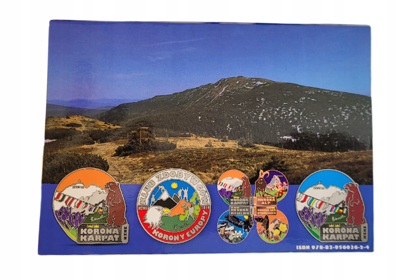 Обложка окрашена с обеих сторон, снаружи ламинирована, соответствующей жесткости. На лицевой стороне книги "Корона Карпаты" есть "Высокая Каська, Грубо Башка и Кудлато Марышка" :) т.е....Три Короны и стилизованная надпись с названием книги. На последней странице - Бабья Гора, принадлежащая Короне Карпат I, и визуализация трех значков: серебра от двух Корон Карпат и клуба КЗКЕ и так называемого "клевер". На внутренней стороне обложки — зимнее фото Романки. Также там присутствует девиз Клуба Завоевателей Короны Европы:
