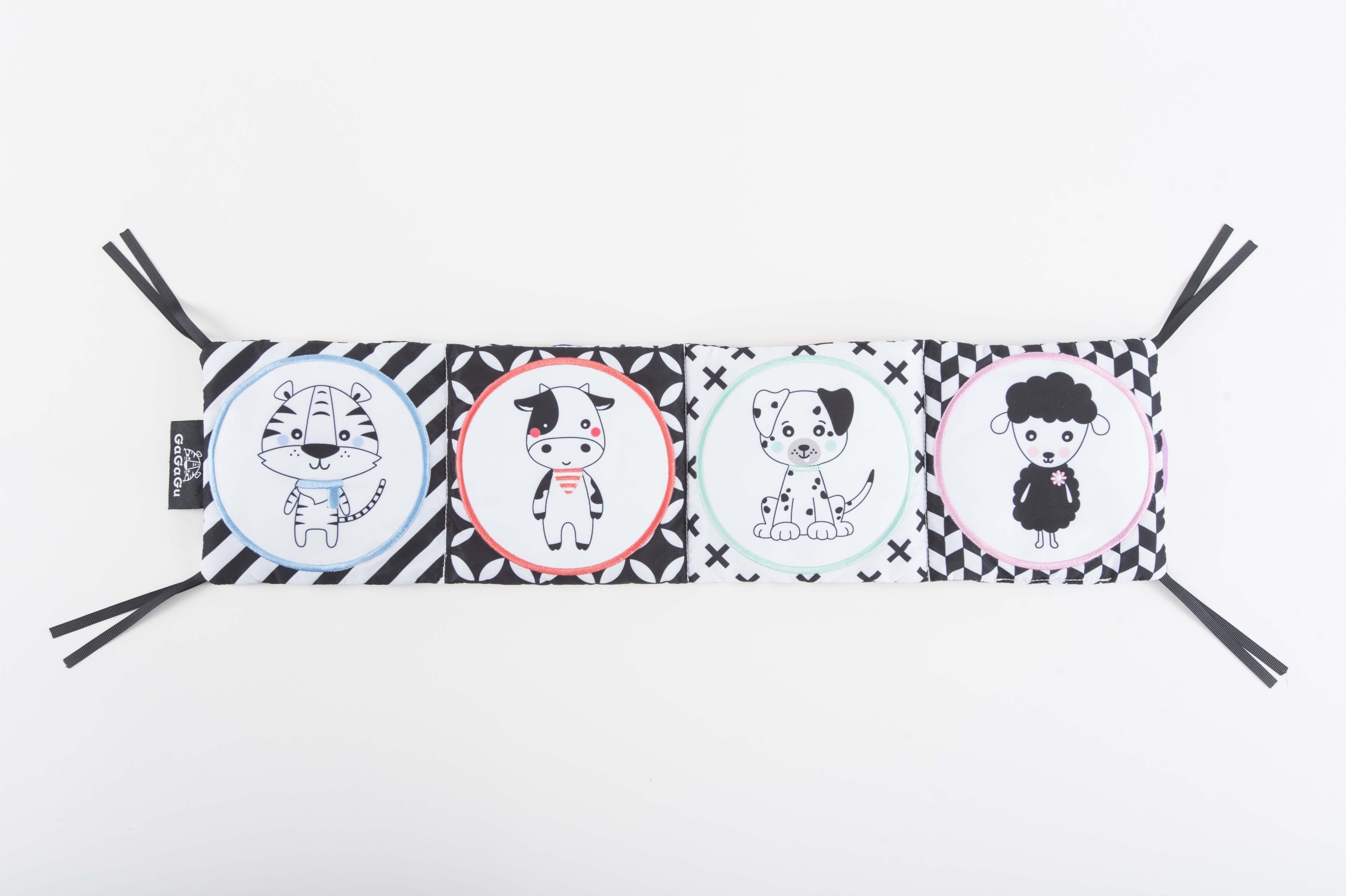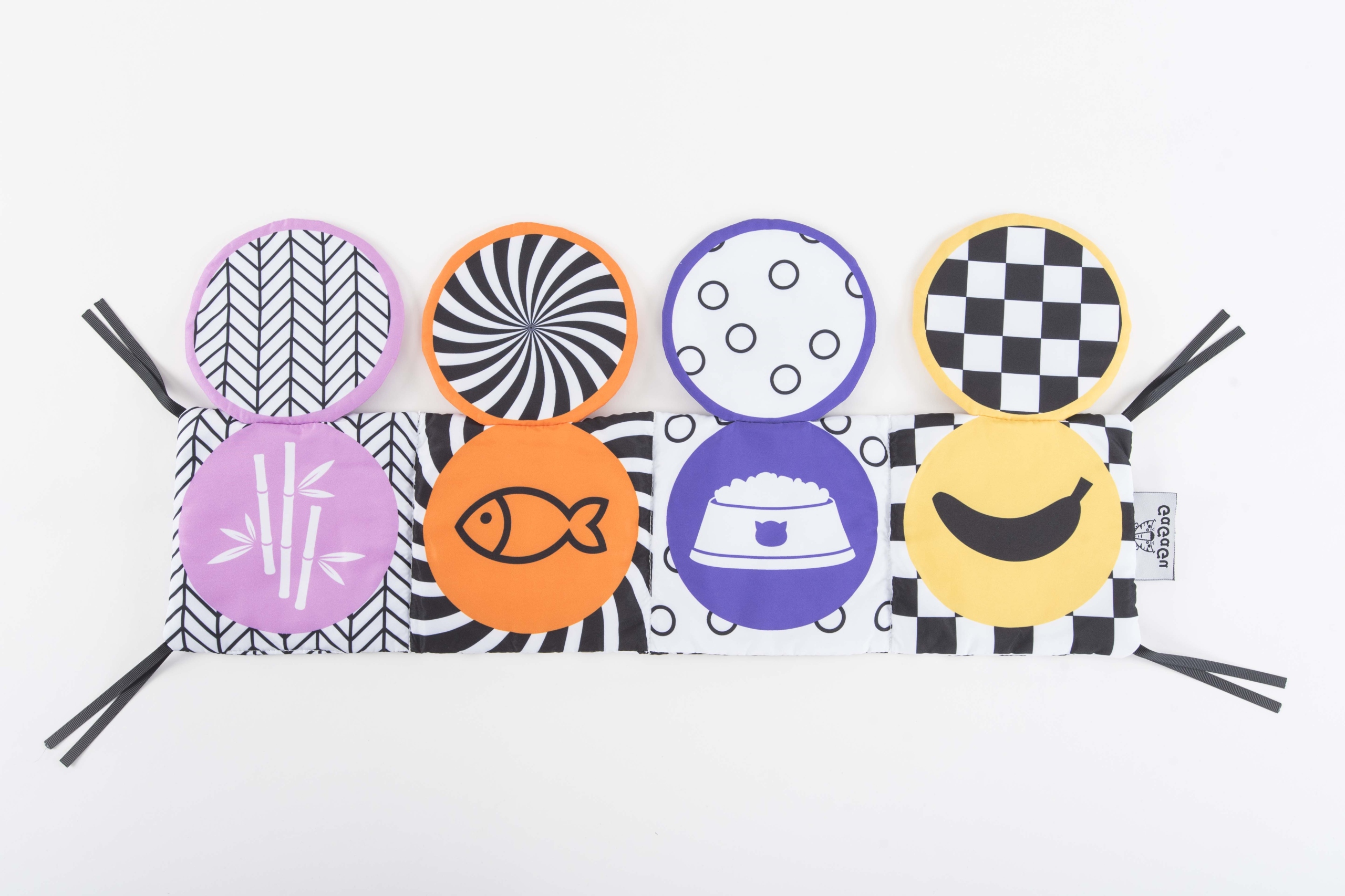 Сенсорная книжка GaGaGu имеет контрастные цвета и узоры, что стимулирует зрение ребенка. Книга двусторонняя. С одной стороны, это контрастные иллюстрации животных с вышитыми элементами, которые обеспечивают заметно разную фактуру под пальчиками ребенка, тактильную стимуляцию и освоение ребенком разных фактур. С другой стороны расположены круглые плюшевые клапаны, которые позволяют вашему ребенку играть в одну из своих любимых игр и какать! - каждый клапан с обеих сторон напечатан разным рисунком – один элемент, два совершенно разных визуальных впечатления. Под плюшевыми лоскутами с изображениями животных расположены символы пищи, которую ест животное + плюшевые лоскуты имеют вшитый материал, который шуршит и шуршит при открытии и прикосновении - ребенок поменьше изучает разные формы и цвета и получает слуховую стимуляцию, ребенок постарше узнает, какую пищу ест данное животное