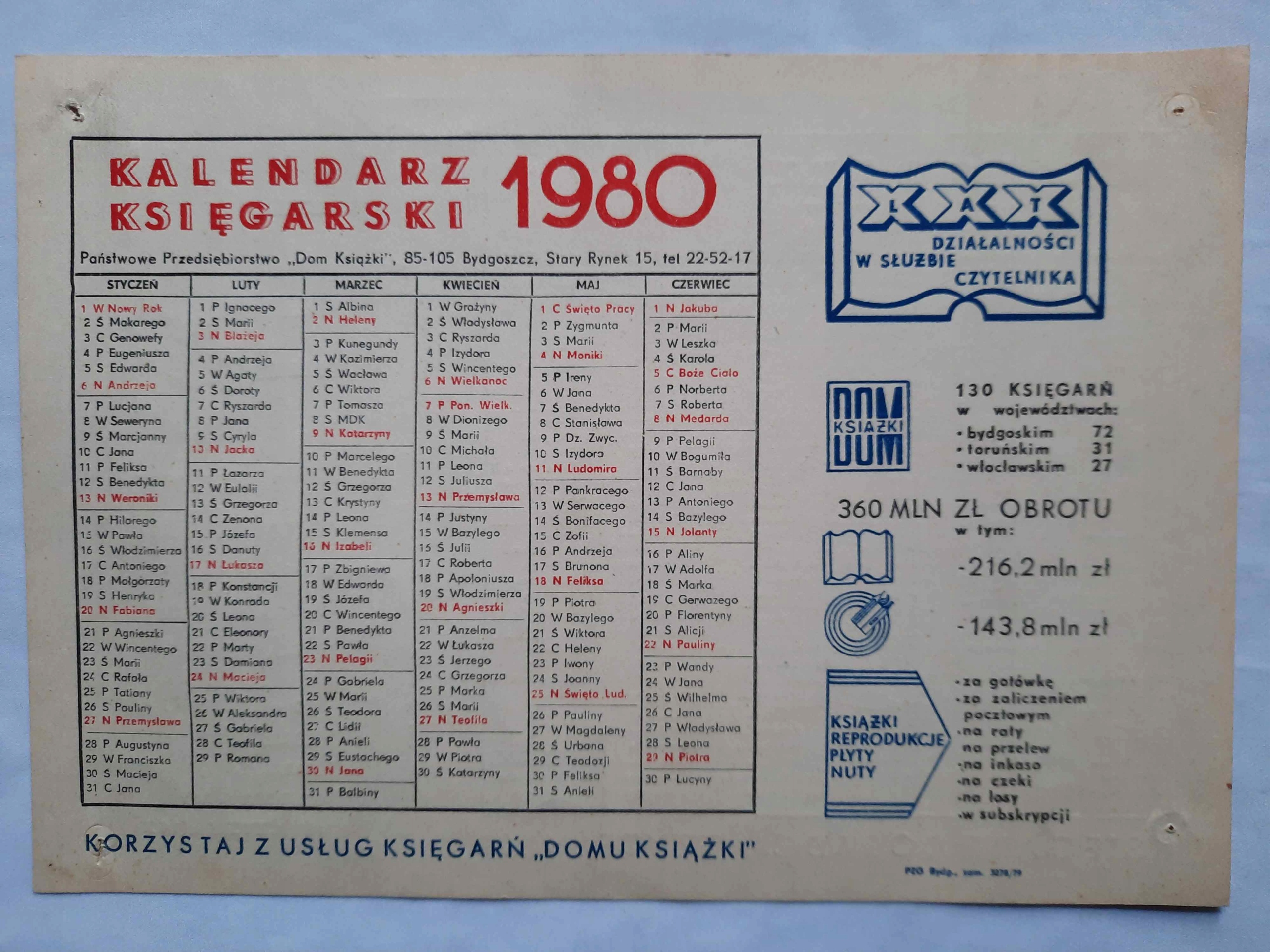 Bydgoszcz Book Calendar Book House 1980 PRL Vanging Calendar