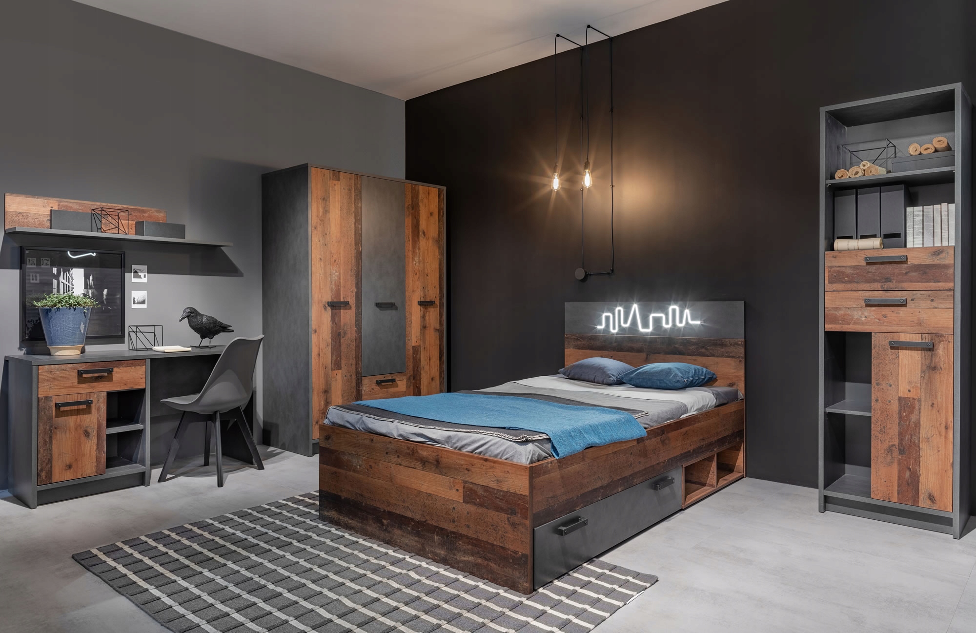 Декор, напоминающий переработанное дерево в сочетании с имитацией бетона, ручки, стилизованные под старину, – характерные черты коллекции Nubi, которая является ярким представителем индустриального стиля. Коллекция создана для смелых подростков, охотно следующих трендам. Несколько грубоватый вид мебели можно согреть естественными акцентами, а «вау»-эффект обеспечит светодиодная панель.