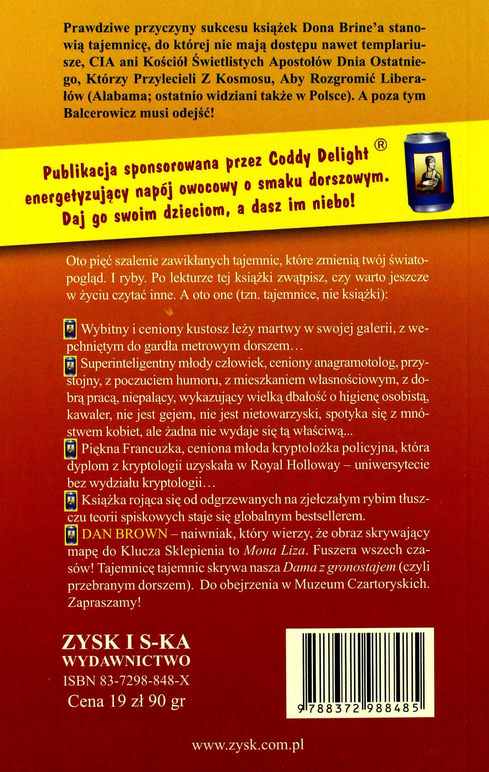 Вот пять чрезвычайно сложных секретов, которые изменят ваше мировоззрение. И рыба. Прочитав эту книгу, вы задаетесь вопросом, стоит ли в своей жизни читать еще какие-нибудь книги. Вот они (т.е. секреты, а не книги): Выдающийся и уважаемый куратор лежит мёртвый в своей галерее, с метровой треской, засунутой ему в глотку... Сверхинтеллектуальный молодой человек, известный анаграмотолог, красавец, с чувством юмора, имеет квартиру, имеет хорошую работу, не курит, уделяет большое внимание личной гигиене, холост, не гей, не необщительный, встречается со многими женщинами, но ни одна из них не кажется правильной один... Красивая француженка, уважаемый молодой полицейский криптолог, получившая диплом по криптологии в Ройял Холлоуэй - университете без кафедры криптологии... Книга, полная теорий заговора, разогретых в прогорклом рыбьем жире, становится мировым бестселлером. Дэн Браун — наивный человек, считающий, что картина, содержащая карту Ключа от Хранилища, — это «Мона Лиза».