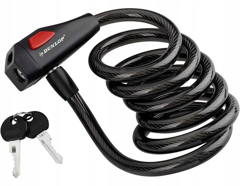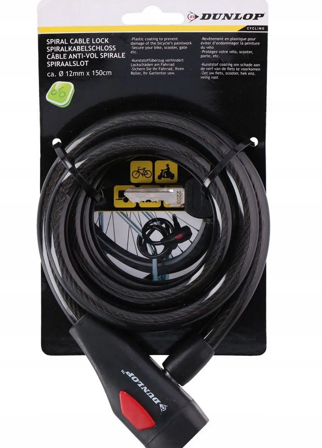 ВЕЛОСИПЕДНЫЙ ЗАМОК СПИРАЛЬНЫЙ DUNLOP С КЛЮЧОМ 1,2x150 см - ТОЛСТЫЙ КАБЕЛЬ